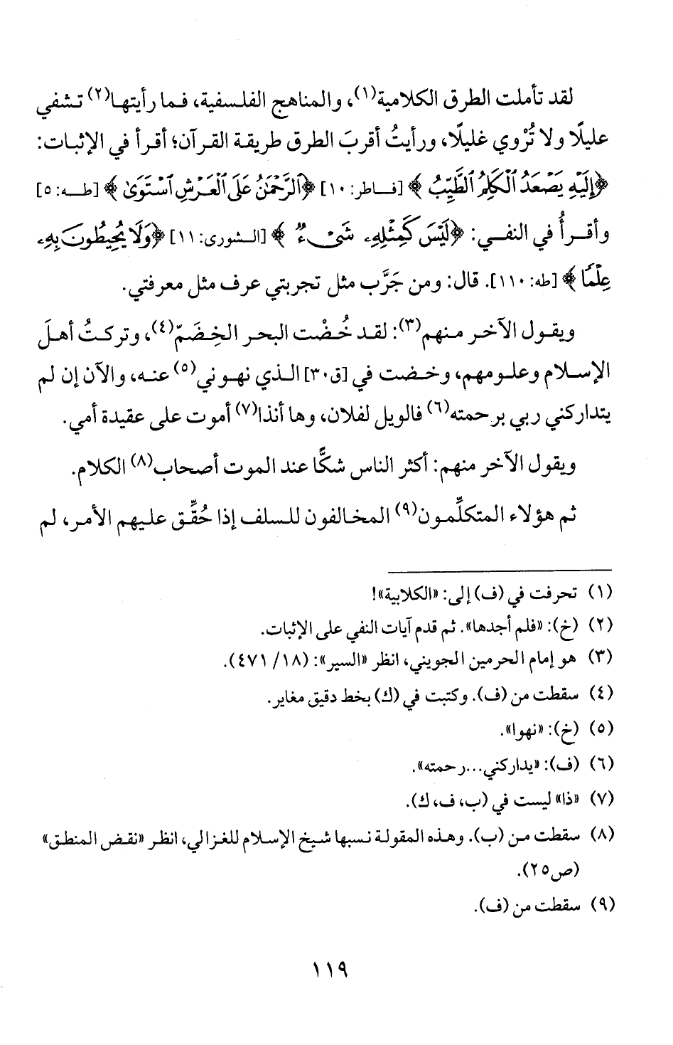 لقد تأملت الطرق الكلامية (1)، والمناهج الفلسفية، فما رأيتها (2) تشفي