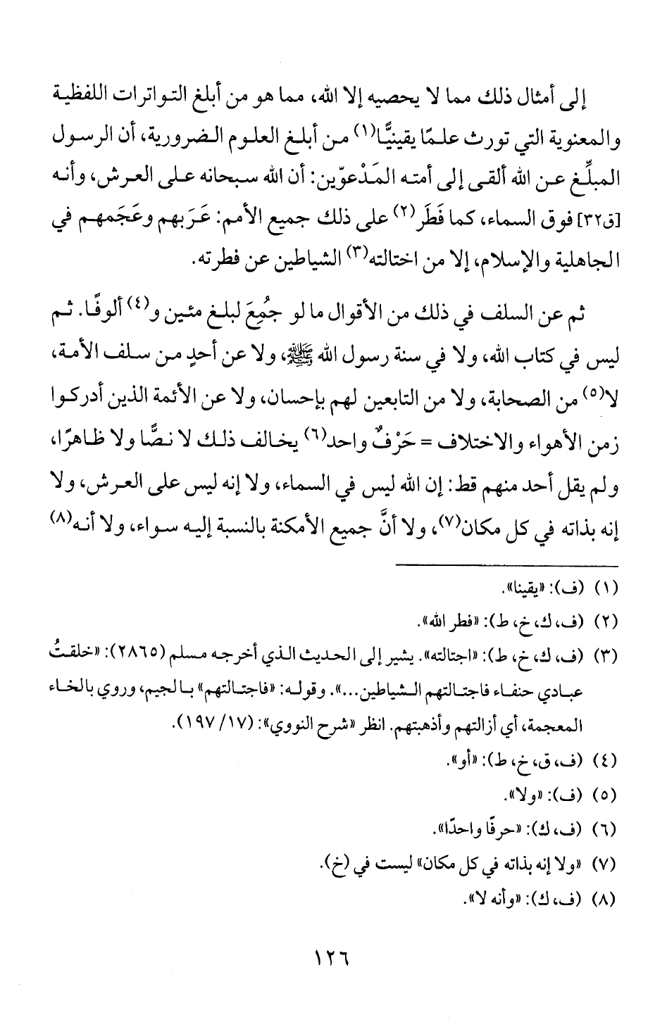 ولم يقل احد منهم قط: إن الله ليس في السماء، ولا إنه ليس على العرش، ولا