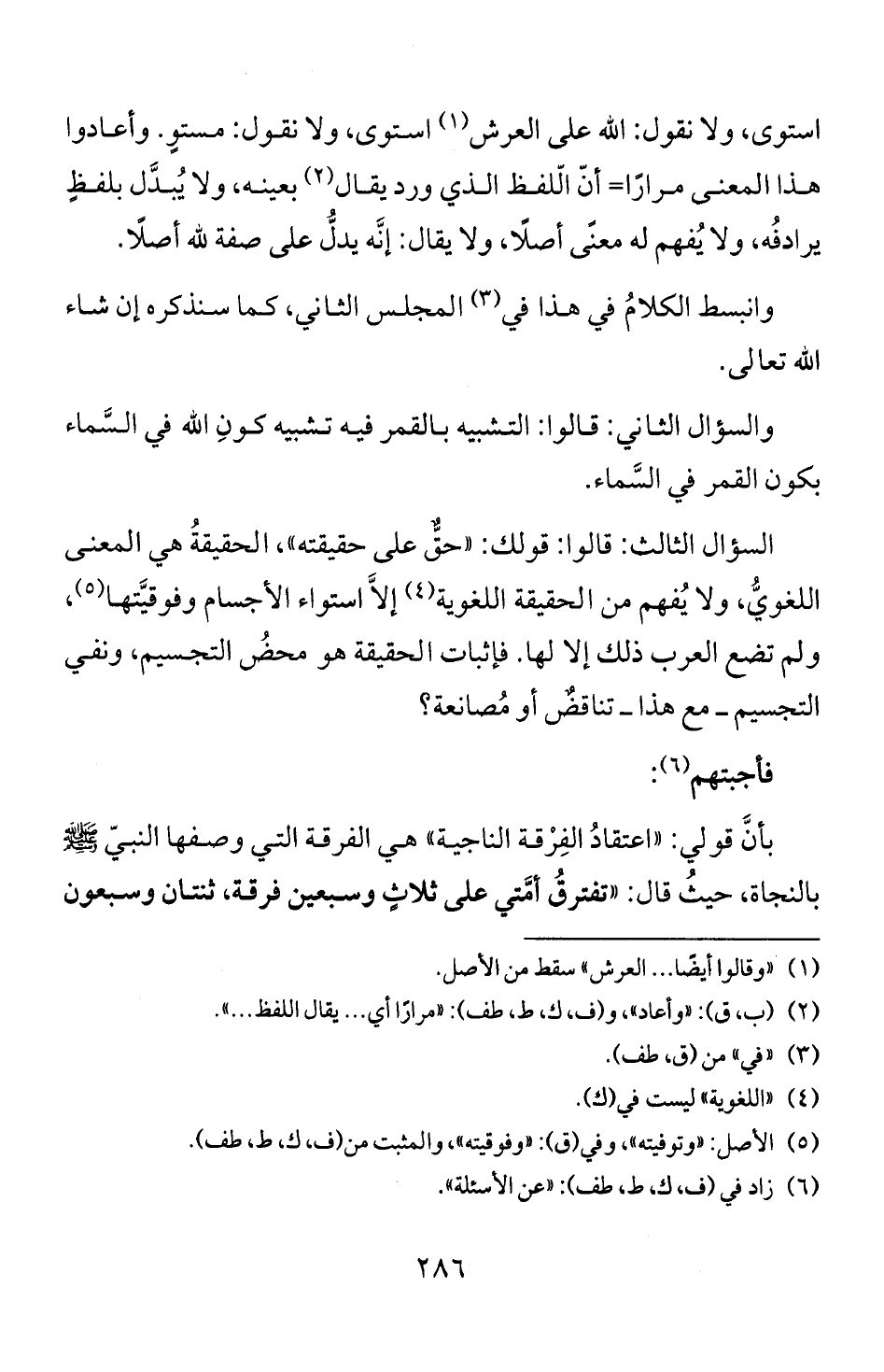 بأن قو لي: " اعتقاد الفرقة الناجية " هي الفرقة التي وصفها النبي لمج!