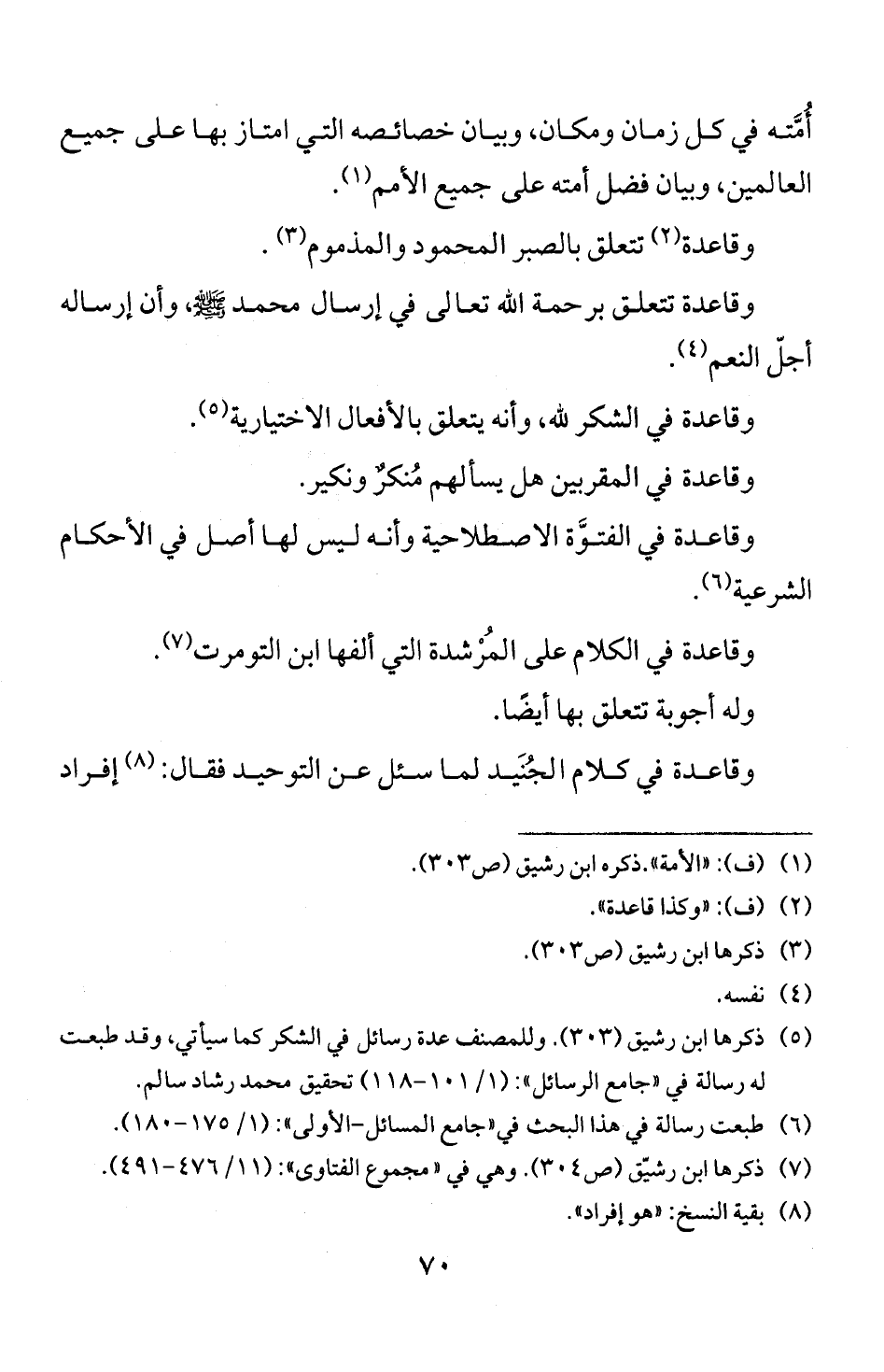 (7) ذكرها 1 بن رشيق (ص 4 0 3). وهي في " مجموع الفتاوى ": (1 1/ 476 - 91 4).