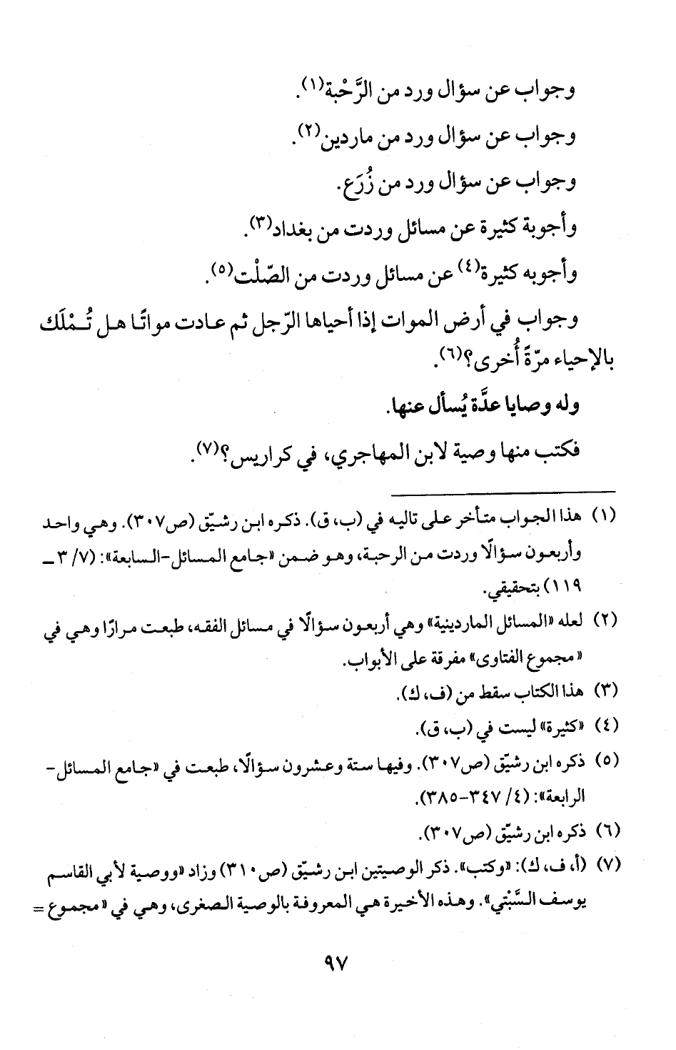 ذكره ابن رشيق (ص 07 3). وفيها ستة وعشرون سؤالا، طبعت في "جامع المسائل-