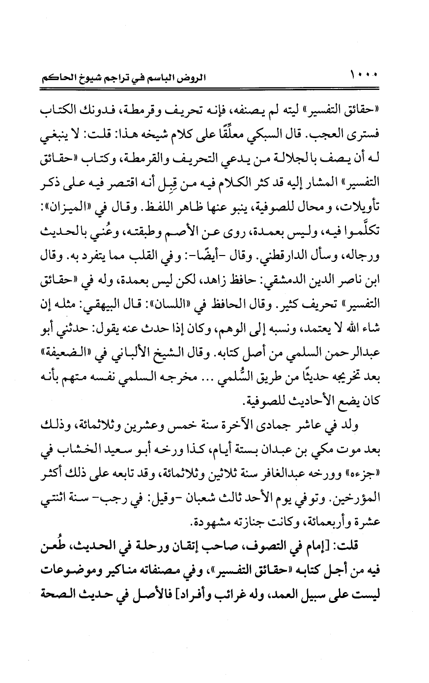"حقائق التفسير" ليته لم يصنفه، فإنه تحريف وقرمطة، فدونك الكتاب فسترى العجب. قال السبكي معلِّقًا على كلام شيخه هذا: قلت: لا ينبغي له أن يصف بالجلالة من يدعي التحريف والقرمطة، وكتاب "حقائق التفسير" المشار إليه قد كثر الكلام فيه من قِبِل أنه اقتصر فيه على ذكر تأويلات، ومحال للصوفية، ينبو عنها ظاهر اللفظ. وقال في "الميزان": تكلَّموا فيه، وليس بعمدة، روى عن الأصم وطبقته، وعُني بالحديث ورجاله، وسأل الدارقطني. وقال -أيضًا-: وفي القلب مما يتفرد به. وقال ابن ناصر الدين الدمشقي: حافظ زاهد، لكن ليس بعمدة، وله في "حقائق التفسير" تحريف كثير. وقال الحافظ في "اللسان": قال البيهقي: مثله إن شاء الله لا يعتمد، ونسبه إلى الوهم، وكان إذا حدث عنه يقول: حدثني أبو عبد الرحمن السلمي من أصل كتابه. وقال الشيخ الألباني في "الضعيفة" بعد تخريجه حديثًا من طريق السُّلمي ... مخرجه السلمي نفسه متهم بأنه كان يضع الأحاديث للصوفية.