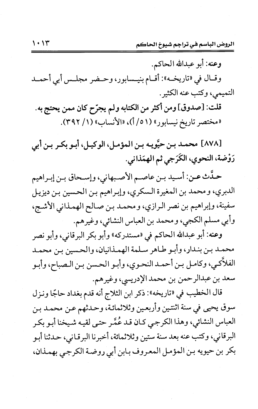 [878] محمد بن حيَّويه بن المؤمل، الوكيل، أبو بكر بن أبي رَوْضة، النحوي، الكَرَجي ثم الهمَذاني.