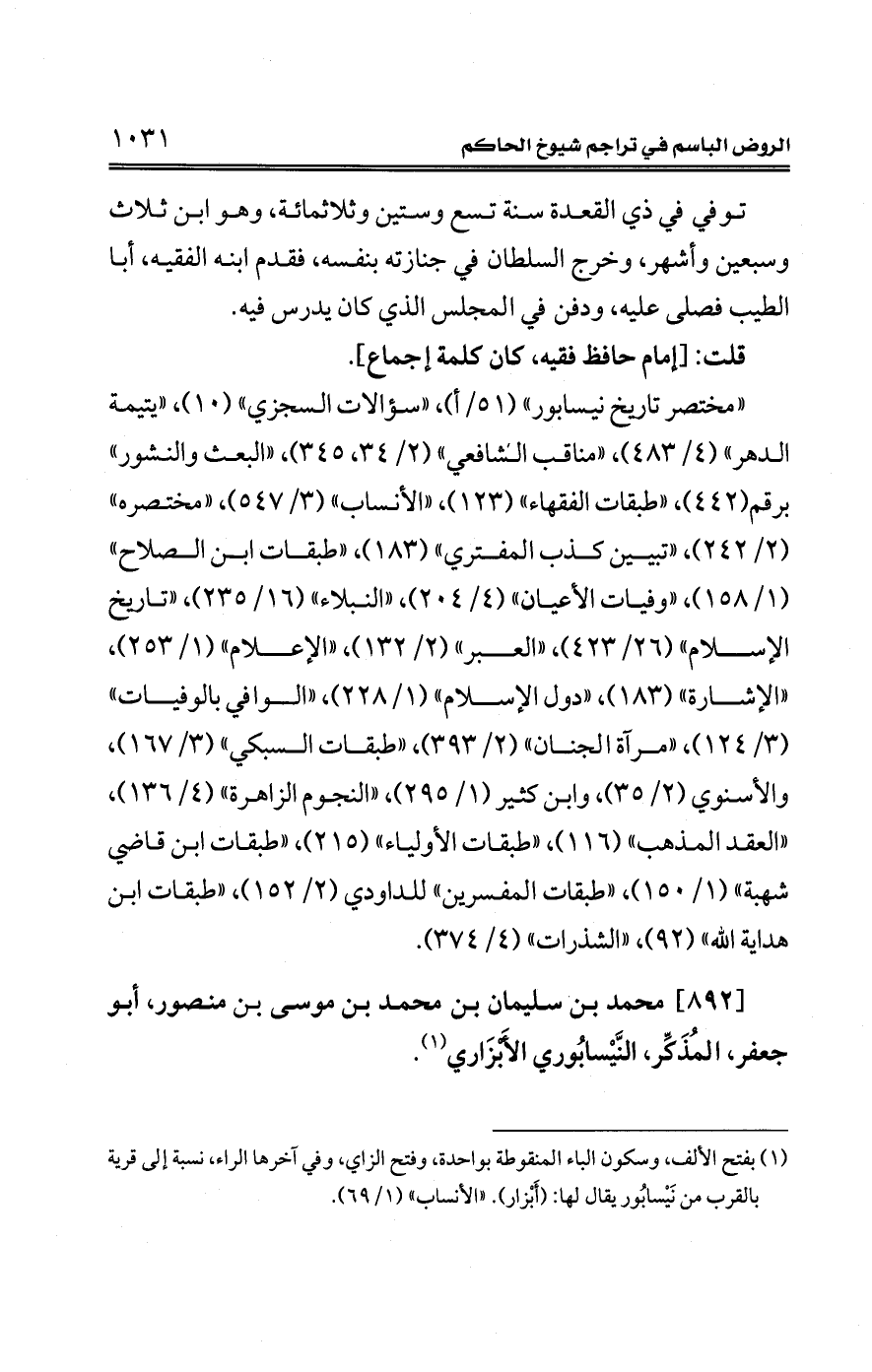 [892] محمد بن سليمان بن محمد بن موسى بن منصور، أبو جعفر، المُذَكِّر، النَّيْسابُوري الأَبْزَاري (¬1).