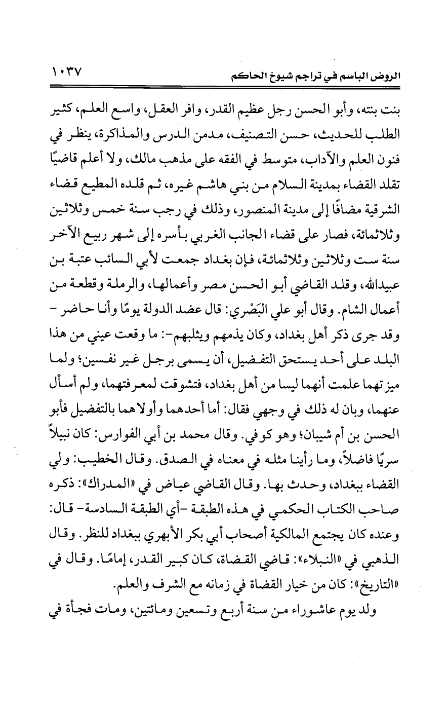 بنت بنته، وأبو الحسن رجل عظيم القدر، وافر العقل، واسع العلم، كثير الطلب للحديث، حسن التصنيف، مدمن الدرس والمذاكرة، ينظر في فنون العلم والآداب، متوسط في الفقه على مذهب مالك، ولا أعلم قاضيًا تقلد القضاء بمدينة السلام من بني هاشم غيره، ثم قلده المطيع قضاء الشرقية مضافًا إلى مدينة المنصور، وذلك في رجب سنة خمس وثلاثين وثلاثمائة، فصار على قضاء الجانب الغربي بأسره إلى شهر ربيع الآخر سنة ست وثلاثين وثلاثمائة، فإن بغداد جمعت لأبي السائب عتبة بن عبيد الله، وقلد القاضي أبو الحسن مصر وأعمالها، والرملة وقطعة من أعمال الشام. وقال أبو علي البَصْري: قال عضد الدولة يومًا وأنا حاضر -وقد جرى ذكر أهل بغداد، وكان يذمهم ويثلبهم-: ما وقعت عيني من هذا البلد على أحد يستحق التفضيل، أن يسمى برجل غير نفسين؛ ولما ميزتهما علمت أنهما ليسا من أهل بغداد، فتشوقت لمعرفتهما، ولم أسأل عنهما، وبأن له ذلك في وجهي فقال: أما أحدهما وأولاهما بالتفضيل فأبو الحسن بن أم شيبان؛ وهو كوفي. وقال محمد بن أبي الفوارس: كان نبيلًا سريًا فاضلًا، وما رأينا مثله في معناه في الصدق. وقال الخطيب: ولي القضاء ببغداد، وحدث بها. وقال القاضي عياض في "المدراك": ذكره صاحب الكتاب الحكمي في هذه الطبقة -أي الطبقة السادسة- قال: وعنده كان يجتمع المالكية أصحاب أبي بكر الأبهري ببغداد للنظر. وقال الذهبي في "النبلاء": قاضي القضاة، كان كبير القدر، إمامًا. وقال في "التاريخ": كان من خيار القضاة في زمانه مع الشرف والعلم.