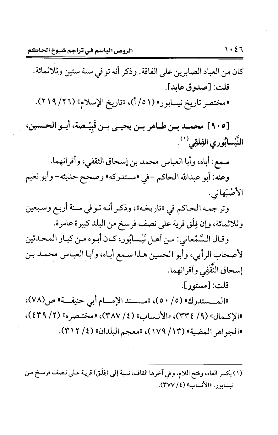 [905] محمد بن طاهر بن يحيى بن قَبِيْصة، أبو الحسين، النَّيْسابُوري الفِلقِي (¬1).