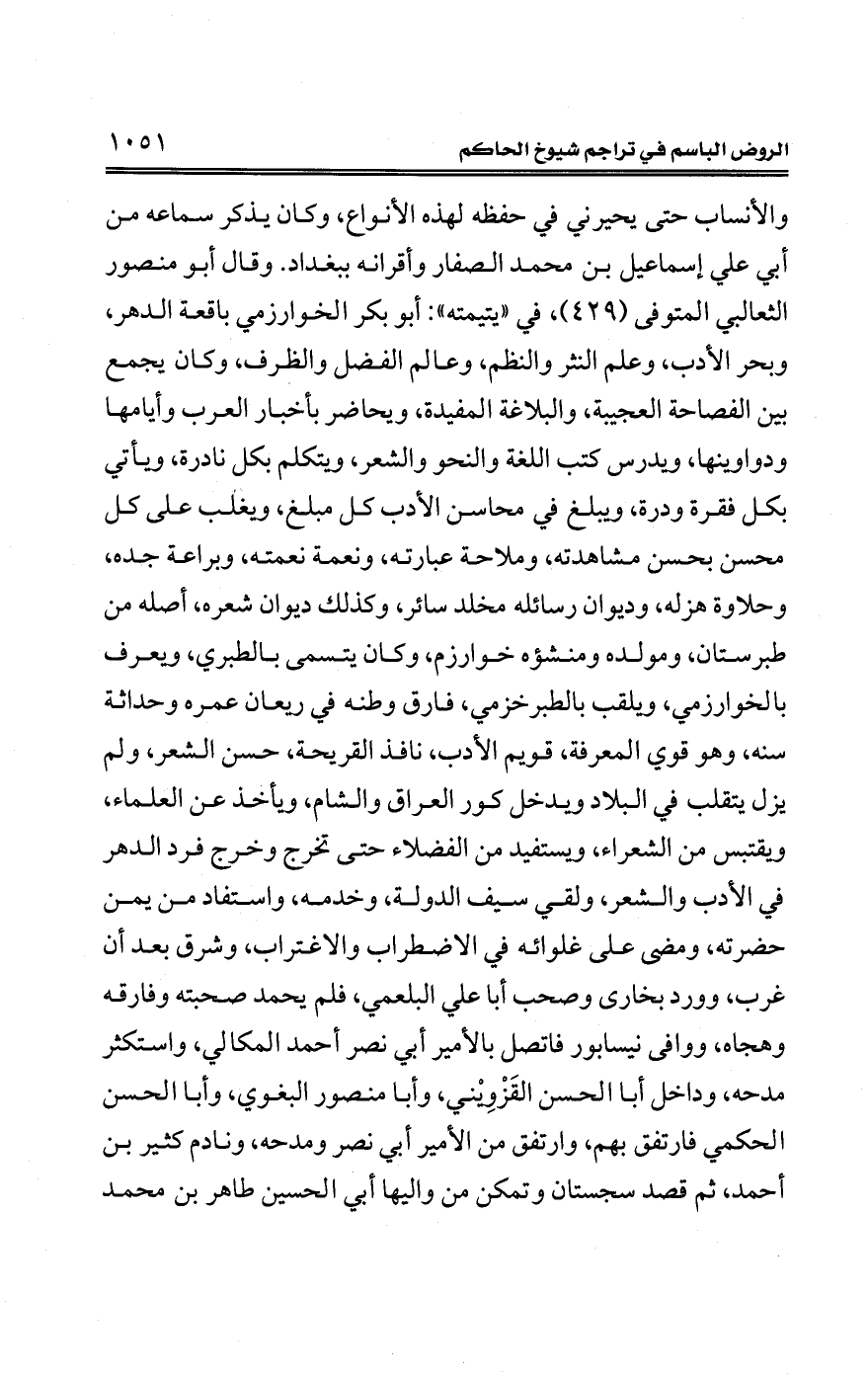 والأنساب حتى يحيرني في حفظه لهذه الأنواع، وكان يذكر سماعه من أبي علي إسماعيل بن محمَّد الصفار وأقرانه ببغداد. وقال أبو منصور الثعالبي المتوفي (429)، في "يتيمته"؛ أبو بكر الخوارزمي باقعة الدهر، وبحر الأدب، وعلم النثر والنظم، وعالم الفضل والظرف، وكان يجمع بين الفصاحة العجيبة، والبلاغة المفيدة، ويحاضر بأخبار العرب وأيامها ودواوينها، ويدرس كتب اللغة والنحو والشعر، ويتكلم بكل نادرة، ويأتي بكل فقرة ودرة، ويبلغ في محاسن الأدب كل مبلغ، ويغلب على كل محسن بحسن مشاهدته، وملاحة عبارته، ونعمة نعمته، وبراعة جده، وحلاوة هزله، وديوان رسائله مخلد سائر، وكذلك ديوان شعره، أصله من طبرستان، ومولده ومنشؤه خوارزم، وكان يتسمى بالطبري، ويعرف بالخوارزمي، ويلقب بالطبرخزمي، فارق وطنه في ريعان عمره وحداثة سنه، وهو قوي المعرفة، قويم الأدب، نافذ القريحة، حسن الشعر، ولم يزل يتقلب في البلاد ويدخل كور العراق والشام، ويأخذ عن العلماء، ويقتبس من الشعراء، ويستفيد من الفضلاء حتى تخرج وخرج فرد الدهر في الأدب والشعر، ولقي سيف الدولة، وخدمه، واستفاد من يمن حضرته، ومضى على غلوائه في الاضطراب والاغتراب، وشرق بعد أن غرب، وورد بخارى وصحب أبا علي البلعمي، فلم يحمد صحبته وفارقه وهجاه، ووافى نيسابور فاتصل بالأمير أبي نصر أحمد المكالي، واستكثر مدحه، وداخل أبا الحسن القَزْويني، وأبا منصور البغوي، وأبا الحسن الحكمي فارتفق بهم، وارتفق من الأمير أبي نصر ومدحه، ونادم كثير بن أحمد، ثم قصد سجستان وتمكن من واليها أبي الحسين طاهر بن محمَّد
