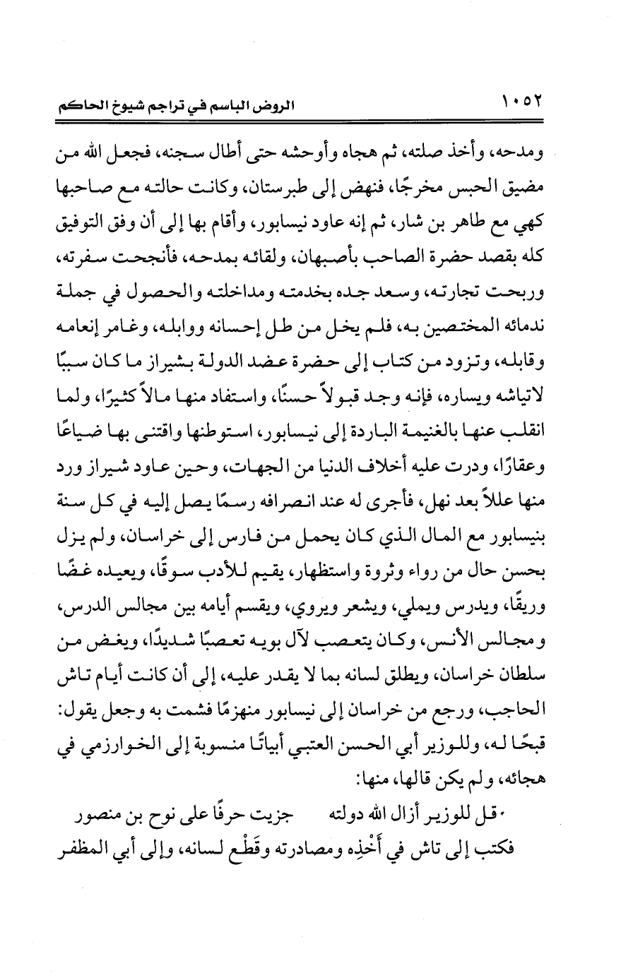 ومدحه، وأخذ صلته، ثم هجاه وأوحشه حتى أطال سجنه، فجعل الله من مضيق الحبس مخرجًا، فنهض إلى طبرستان، وكانت حالته مع صاحبها كهي مع طاهر بن شار، ثم إنه عاود نيسابور، وأقام بها إلى أن وفق التوفيق كله بقصد حضرة الصاحب بأصبهان، ولقائه بمدحه، فأنجحت سفرته، وربحت تجارته، وسعد جده بخدمته ومداخلته والحصول في جملة ندمائه المختصين به، فلم يخل من طل إحسانه ووابله، وغامر إنعامه وقابله، وتزود من كتاب إلى حضرة عضد الدولة بشيراز ما كان سببًا لاتياشه ويساره، فإنه وجد قبولًا حسنًا، واستفاد منها مالًا كثيرًا، ولما انقلب عنها بالغنيمة الباردة إلى نيسابور، استوطنها واقتنى بها ضياعًا وعقارًا، ودرت عليه أخلاف الدنيا من الجهات، وحين عاود شيراز ورد منها عللًا بعد نهل، فأجرى له عند إنصرافه رسمًا يصل إليه في كل سنة بنيسابور مع المال الذي كان يحمل من فارس إلى خراسان، ولم يزل بحسن حال من رواء وثروة واستظهار، يقيم للأدب سوقًا، ويعيده غضًا وريقًا، ويدرس ويملي، ويشعر ويروي، ويقسم أيامه بين مجالس الدرس، ومجالس الأنس، وكان يتعصب لآل بويه تعصبًا شديدًا، ويغض من سلطان خراسان، ويطلق لسانه بما لا يقدر عليه، إلى أن كانت أيام تاش الحاجب، ورجع من خراسان إلى نيسابور منهزمًا فشمت به وجعل يقول: قبحًا له، وللوزير أبي الحسن العتبي أبياتًا منسوبة إلى الخوارزمي في هجائه، ولم يكن قالها، منها: