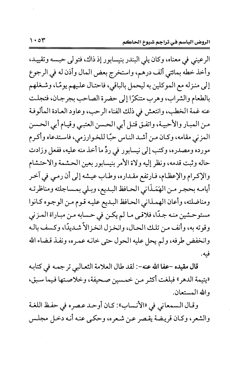 الرعيني في معناه، وكان يلي البندر بنيسابور إذ ذاك، فتولي حبسه وتقييد، وأخذ خطه بمائتي ألف درهم، واستخرج بعض المال وأذن له في الرجوع إلى منزله مع الموكلين به ليحمل بالباقي، فاحتال عليهم يومًا، وشغلهم بالطعام والشراب، وهرب متنكرًا إلى حضرة الصاحب بجرجان، فتجلت عنه غمة الخطب، وانتعش في ذلك الفناء الرحب، وعاود العادة المألوفة من المبار والأحبية، واتفق قتل أبي الحسن العتبي وقيام أبي الحسن المزني مقامه، وكان من أشد الناس حيًا للخوارزمي، فاستدعاه وأكرم مورده ومصدره، وكتب إلى نيسابور في ردِّ ما أخذ منه عليه، ففعل وزادت حاله وثبت قدمه، ونظر إليه ولاة الأمر بنيسابور بعين الحشمة والاحتشام والإكرام والإعظام، فارتفع مقداره، وطاب عيشه إلى أن رمي في آخر أيامه بحجر من الهَمَذَاني الحافظ البديع، وبلي بمساجلته ومناظرته ومناضلته، وأعان الهمذاني الحافظ البديع عليه قوم من الوجوه كانوا مستوحشين منه جدًا، فلاقى ما لم يكن في حسابه من مباراة المزني وقوته به، وأنف من تلك الحال، وانخزل انخزالًا شديدًا، وكسف باله وانخفض طرفه، ولم يحل عليه الحول حتى خانه عمره، ونفذ قضاء الله فيه.