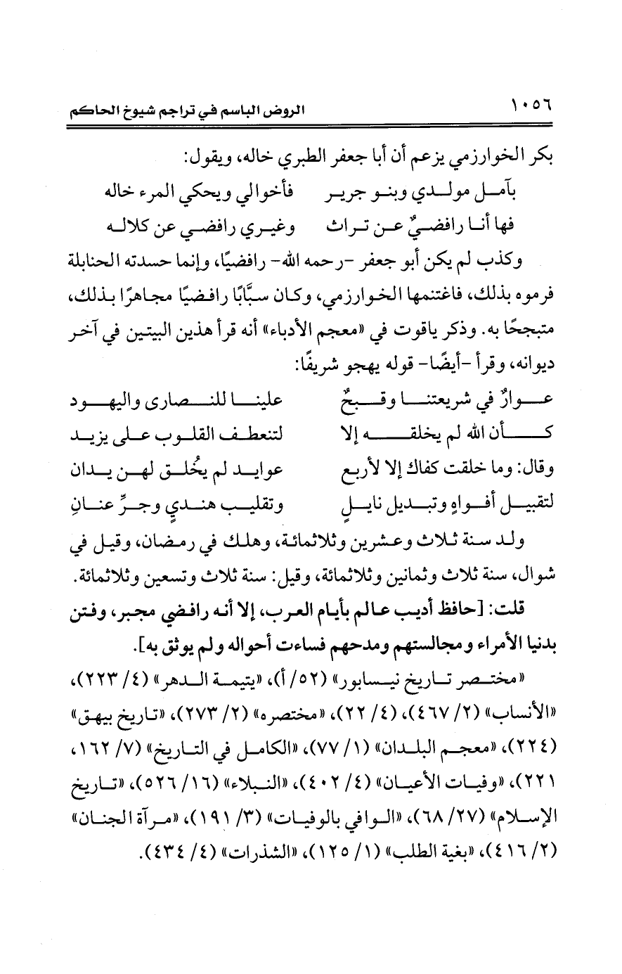 وكذب لم يكن أبو جعفر -رحمه الله- رافضيًا، وإنما حسدته الحنابلة فرموه بذلك، فاغتنمها الخوارزمي، وكان سبَّابًا رافضيًا مجاهرًا بذلك، متبجحًا به. وذكر ياقوت في "معجم الأدباء" أنه قرأ هذين البيتين في آخر ديوانه، وقرأ -أيضًا- قوله يهجو شريفًا: