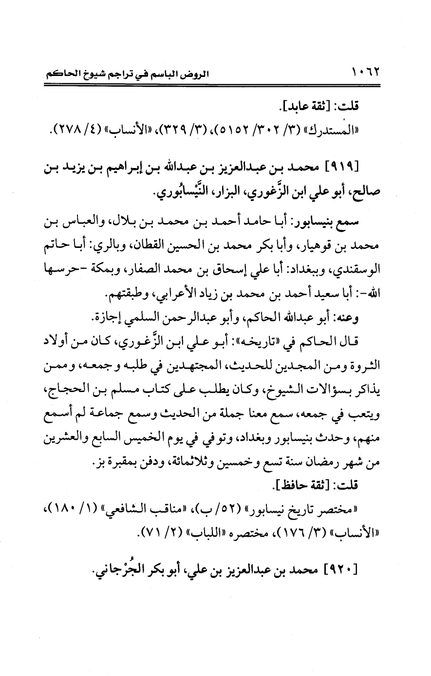 [919] محمَّد بن عبد العزيز بن عبد الله بن إبراهيم بن يزيد بن صالح، أبو علي ابن الزَّغوري، البزار، النَّيْسابُوري.