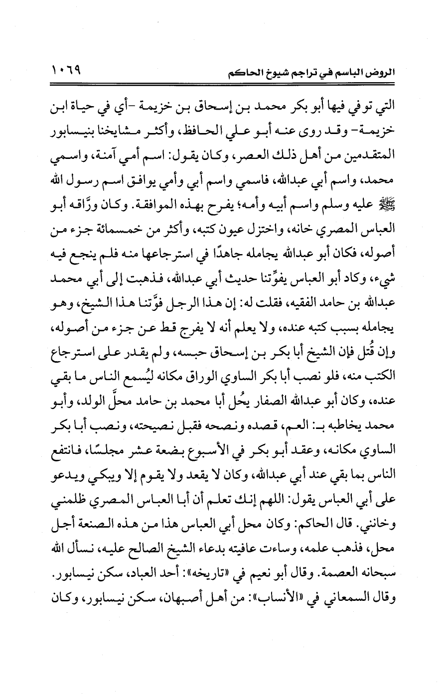 التي توفي فيها أبو بكر محمَّد بن إسحاق بن خزيمة -أي في حياة ابن خزيمة- وقد روى عنه أبو علي الحافظ، وأكثر مشايخنا بنيسابور المتقدمين من أهل ذلك العصر، وكان يقول: اسم أمي آمنة، واسمي محمَّد، واسم أبي عبد الله، فاسمي واسم أبي وأمي يوافق اسم رسول الله - صلى الله عليه وسلم - واسم أبيه وأمه؛ يفرح بهذه الموافقة. وكان ورَّاقه أبو العباس المصري خانه، واختزل عيون كتبه، وأكثر من خمسمائة جزء من أصوله، فكان أبو عبد الله يجامله جاهدًا في استرجاعها منه فلم ينجع فيه شيء، وكاد أبو العباس يفوِّتنا حديث أبي عبد الله، فذهبت إلى أبي محمَّد عبد الله بن حامد الفقيه، فقلت له: إن هذا الرجل فوَّتنا هذا الشيخ، وهو يجامله بسبب كتبه عنده، ولا يعلم أنه لا يفرج قط عن جزء من أصوله، وإن قُتل فان الشيخ أبا بكر بن إسحاق حبسه، ولم يقدر على استرجاع الكتب منه، فلو نصب أبا بكر الساوي الوراق مكانه ليُسمع الناس ما بقي عنده، وكان أبو عبد الله الصفار يحُل أبا محمَّد بن حامد محلَّ الولد، وأبو محمَّد يخاطبه بـ: العم، قصده ونصحه فقبل نصيحته، ونصب أبا بكر الساوي مكانه، وعقد أبو بكر في الأسبوع بضعة عشر مجلسًا، فانتفع الناس بما بقي عند أبي عبد الله، وكان لا يقعد ولا يقوم إلا ويبكي ويدعو على أبي العباس يقول: اللهم إنك تعلم أن أبا العباس المصري ظلمني وخانني. قال الحاكم: وكان محل أبي العباس هذا من هذه الصنعة أجل محل، فذهب علمه، وساءت عافيته بدعاء الشيخ الصالح عليه، نسأل الله سبحانه العصمة. وقال أبو نعيم في "تاريخه": أحد العباد، سكن نيسابور. وقال السمعاني في "الأنساب": من أهل أصبهان، سكن نيسابور، وكان