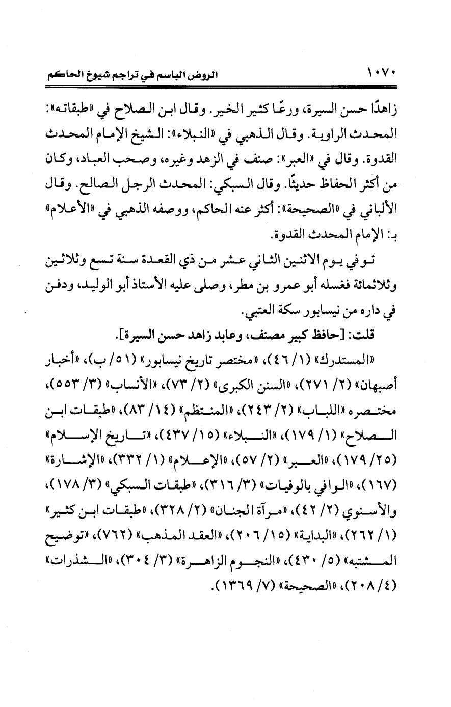 "المستدرك" (1/ 46)، "مختصر تاريخ نيسابور" (51/ ب)، "أخبار أصبهان" (2/ 271)، "السنن الكبرى" (2/ 73)، "الأنساب" (3/ 553)، مختصره "اللباب" (2/ 243)، "المنتظم" (14/ 83)، "طبقات ابن الصلاح" (1/ 179)، "النبلاء" (15/ 437)، "تاريخ الإِسلام" (25/ 179)، "العبر" (2/ 57)، "الإعلام" (1/ 332)، "الإشارة" (167)، "الوافي بالوفيات" (3/ 316)، "طبقات السبكي" (3/ 178)، والأسنوي (2/ 42)، "مرآة الجنان" (2/ 328)، "طبقات ابن كثير" (1/ 262)، "البداية" (15/ 206)، "العقد المذهب" (762)، "توضيح المشتبه" (5/ 430)، "النجوم الزاهرة" (3/ 304)، "الشذرات" (4/ 208)، "الصحيحة" (7/ 1369).