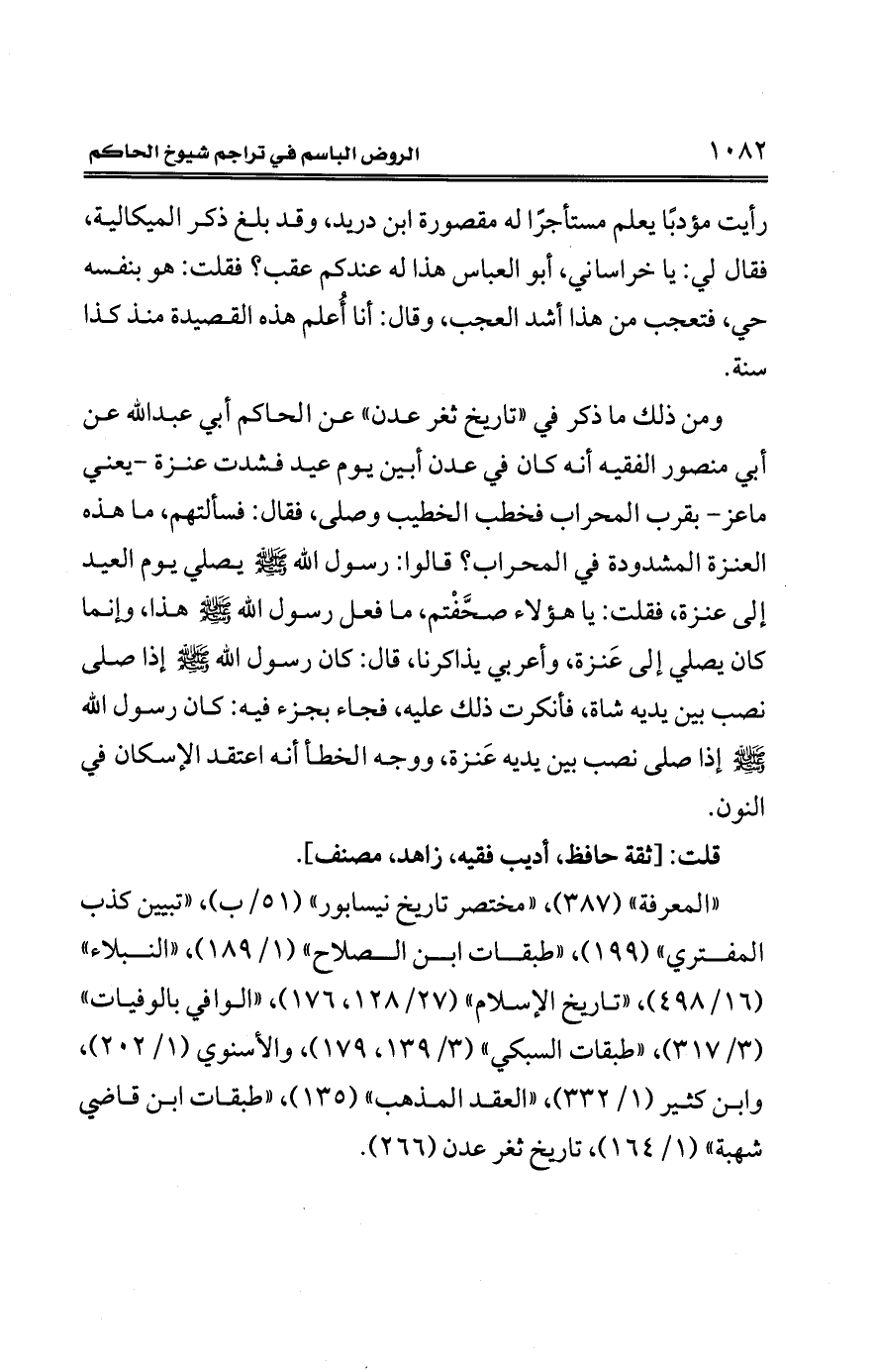 ومن ذلك ما ذكر في "تاريخ ثغر عدن" عن الحاكم أبي عبد الله عن أبي منصور الفقيه أنه كان في عدن أبين يوم عيد فشدت عنزة -يعني ماعز- بقرب المحراب فخطب الخطيب وصلى، فقال: فسألتهم، ما هذه العنزة المشدودة في المحراب؟ قالوا: رسول الله - صلى الله عليه وسلم - يصلي يوم العيد إلى عنزة، فقلت: يا هؤلاء صحَّفْتم، ما فعل رسول الله - صلى الله عليه وسلم - هذا، وإنما كان يصلي إلى عَنزة، وأعربي يذاكرنا، قال: كان رسول الله - صلى الله عليه وسلم - إذا