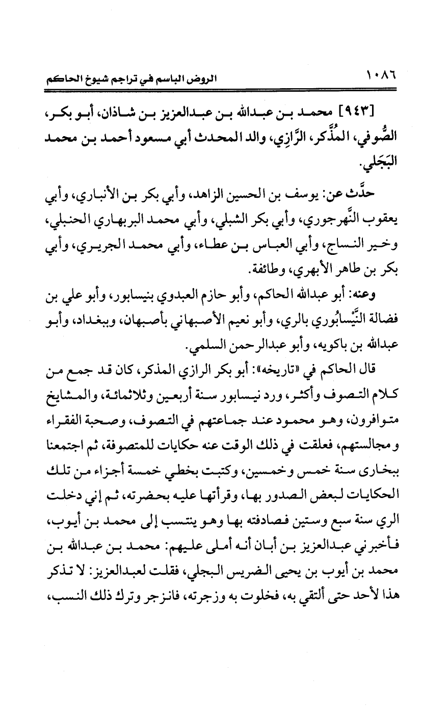 [943] محمَّد بن عبد الله بن عبد العزيز بن شاذان، أبو بكر، الصّوفي، المُذَّكر، الرَّازِي، والد المحدث أبي مسعود أحمد بن محمَّد البَجَلي.