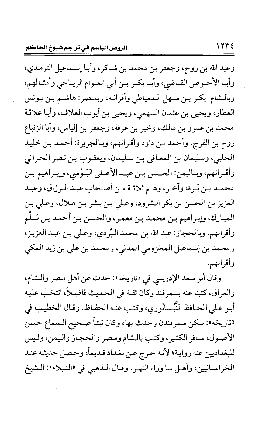 وعبد الله بن روح، وجعفر بن محمَّد بن شاكر، وأبا إسماعيل الترمذي، وأبا الأحوص القاضي، وأبا بكر بن أبي العوام الرياحي وأمثالهم، وبالشام: بكر بن سهل الدمياطي وأقرانه، وبمصر: هاشم بن يونس العطار، ويحيى بن عثمان السهمي، ويحيى بن أيوب العلاف، وأبا علاثة محمَّد بن عمرو بن مالك، وخير بن عرفة، وجعفر بن إلياس، وأبا الزنباع روح بن الفرج، وأحمد بن داود وأقرانهم، وبالجزيرة: أحمد بن خليد الحلبي، وسليمان بن المعانى بن سليمان، ويعقوب بن نصر الحراني وأقرانهم، وباليمن: الحسن بن عبد الأعلى البّوْسي، وإبراهيم بن محمَّد بن بّرة، وآخر، وهم ثلاثة من أصحاب عبد الرزاق، وعبد العزيز بن الحسن بن بكر الشرود، وعلي بن بشر بن هلال، وعلي بن المبارك، وإبراهيم بن محمَّد بن معمر، والحسن بن أحمد بن سَلْم وأقرانهم. وبالحجاز: عبد الله بن محمَّد البُردي، وعلي بن عبد العزيز، ومحمد بن إسماعيل المخزومي المدني، ومحمد بن علي بن زيد المكي وأقرانهم.