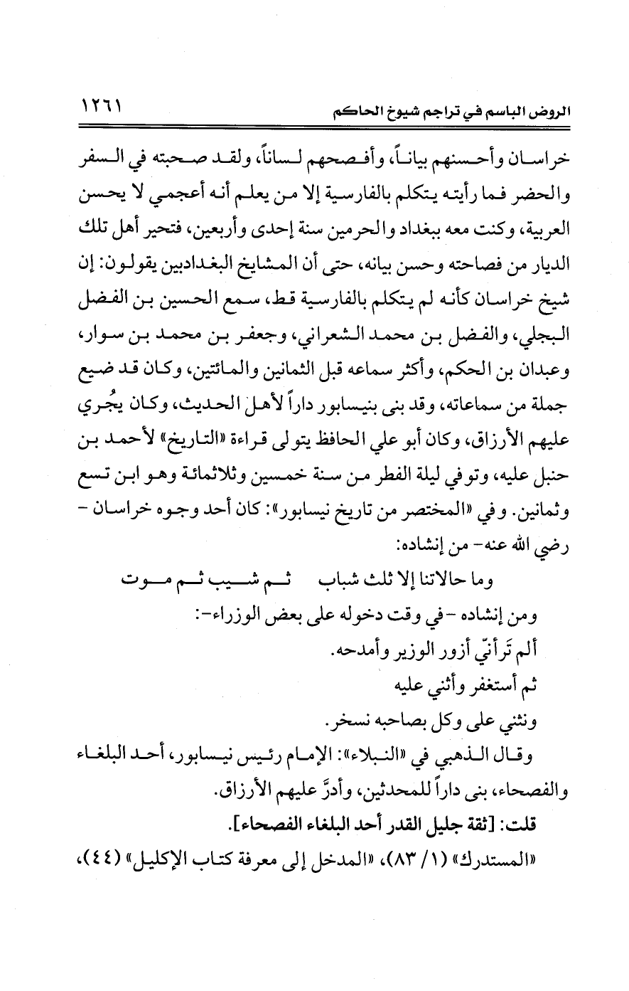 خراسان وأحسنهم بيانًا، وأفصحهم لسانًا، ولقد صحبته في السفر والحضر فما رأيته يتكلم بالفارسية إلا من يعلم أنه أعجمي لا يحسن العربية، وكنت معه ببغداد والحرمين سنة إحدى وأربعين، فتحير أهل تلك الديار من فصاحته وحسن بيانه، حتى أن المشايخ البغدادبين يقولون: إن شيخ خراسان كأنه لم يتكلم بالفارسية قط، سمع الحسين بن الفضل البجلي، والفضل بن محمَّد الشعراني، وجعفر بن محمَّد بن سوار، وعبدان بن الحكم، وأكثر سماعه قبل الثمانين والمائتين، وكان قد ضيع جملة من سماعاته، وقد بني بنيسابور دارًا لأهل الحديث، وكان يجُري عليهم الأرزاق، وكان أبو علي الحافظ يتولي قراءة "التاريخ" لأحمد بن حنبل عليه، وتوفي ليلة الفطر من سنة خمسين وثلاثمائة وهو ابن تسع وثمانين. وفي "المختصر من تاريخ نيسابور": كان أحد وجوه خراسان - رضي الله عنه - من إنشاده: