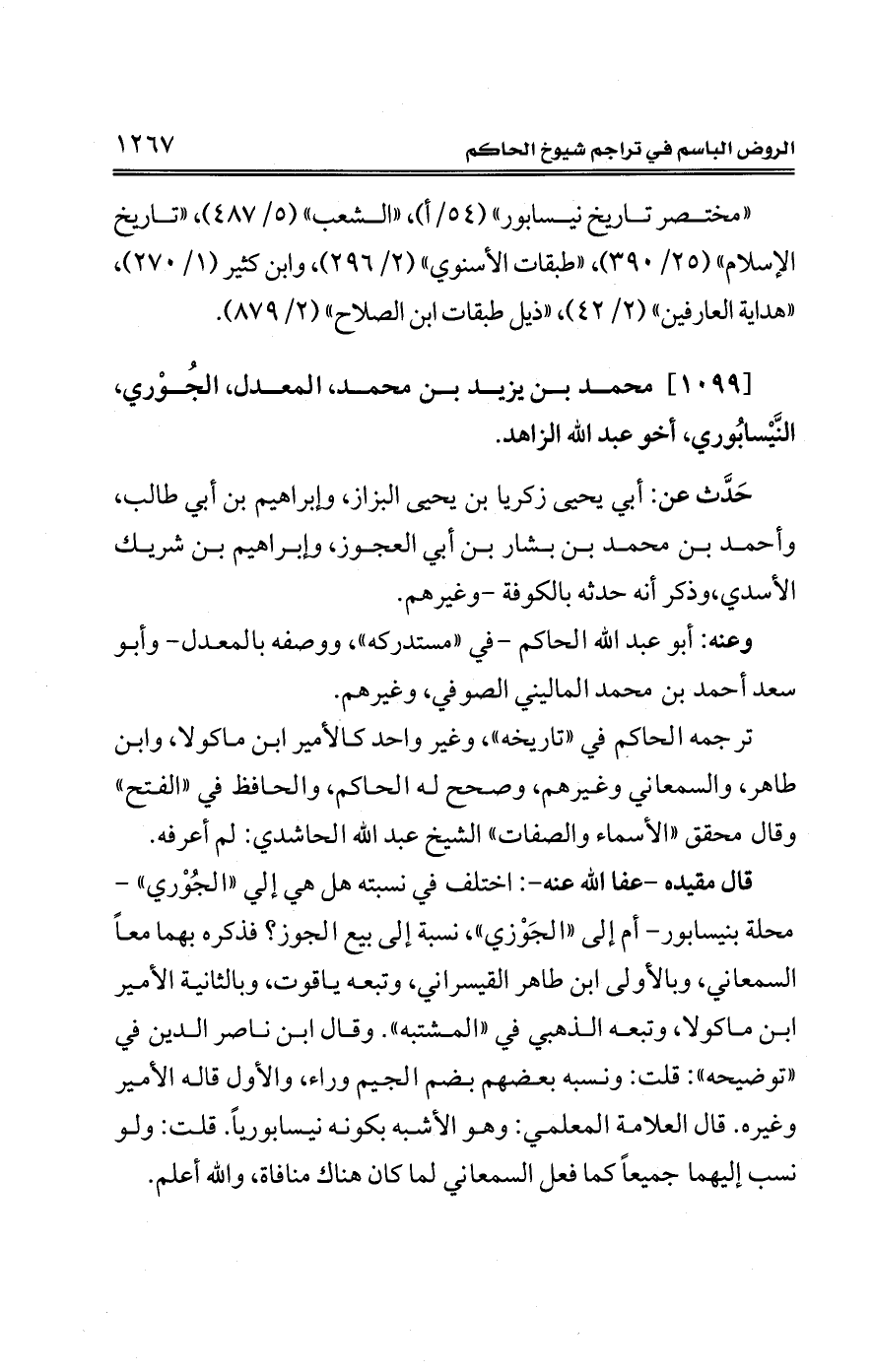 قال مقيده -عفا الله عنه-: اختلف في نسبته هل هي إلى "الجُوْري" -محلة بنيسابور- أم إلى "الجَوْز"، نسبة إلى بيع الجوز؟ فذكره بهما معًا السمعاني، وبالأولى ابن طاهر القيسراني، وتبعه ياقوت، وبالثانية الأمير ابن ماكولا، وتبعه الذهبي في "المشتبه". وقال ابن ناصر الدين في "توضيحه": قلت: ونسبه بعضهم بضم الجيم وراء، والأول قاله الأمير وغيره. قال العلامة المعلمي: وهو الأشبه بكونه نيسابوريًا. قلت: ولو نسب إليهما جميعًا كما فعل السمعاني لما كان هناك منافاة، والله أعلم.