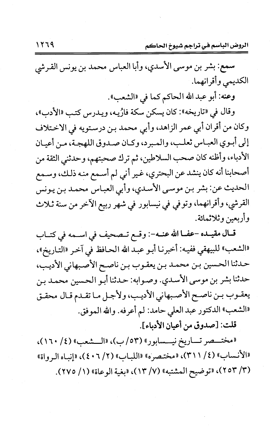 "مخصر تاريخ نيسابور" (53/ ب)، "الشعب" (4/ 160)، "الأنساب" (4/ 311)، "مختصره" "اللباب" (2/ 406)، "إنباه الرواة" (3/ 253)، "توضيح المشتبه" (7/ 13)، "بغية الوعاة" (1/ 275).