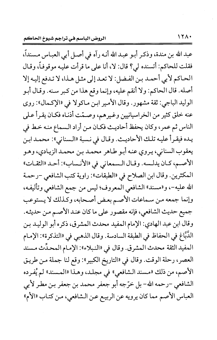 عبد الله بن مندة، وذكر أبو عبد الله أنه رآه في أصل أبي العباس مسندًا، فقلت للحاكم: أتسنده لي؟ قال: لا، أنا على ما قرأت عليه موقوفًا، وقال الحاكم لأبي أحمد بن الفضل: لا تعد إلى مثل هذا، لا تدفع إليه إلا أصله. قال الحاكم: ولا أنقم عليه، وإنما وقع هذا من كبر سنه. وقال أبو الوليد الباجي: ثقة مشهور. وقال الأمير ابن ماكولا في "الإكمال": روى عنه خلق كثير من الخرسانيين وغيرهم، وصمّت أذناه فكان يقرأ على الناس ثم عمر، وكان يحفظ أحاديث فكان من أراد السماع منه خط في يده فيقرأ عليه تلك الأحاديث. وقال في نسبة "السناني": محمَّد ابن يعقوب السناني، يروي عنه أبو طاهر محمَّد بن محمَّد الزيادي، وهو الأصم، كان يدلسه. وقال السمعاني في "الأنساب": أحد "الثقات" المكثرين. وقال ابن الصلاح في "الطبقات": راوية كتب الشافعي -رحمة الله عليه-، و"مسند" الشافعي المعروف، ليس من جمع الشافعي وتأليفه، وإنما جمعه من سماعات الأصم بعض أصحابه، وكذلك لا يستوعب جميع حديث الشافعي، فإنه مقصور على ما كان عند الأصم من حديثه.