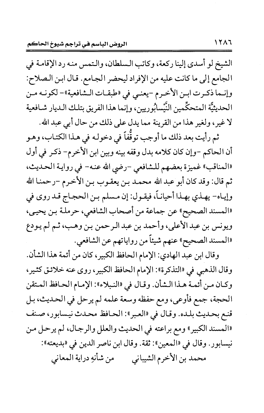 الشيخ لو أسدى إلينا ركعة، وكاتب السلطان، والتمس منه رد الإقامة في الجامع إلى ما كانت عليه من الإفراد ليحضر الجامع. قال ابن الصلاح: وإنما ذكرت ابن الأخرم -يعني في "طبقات الشافعية"- لكونه من الحديثيًّة المتحكِّمين النَّيْسابُوريين، وإنما هذا الفريق بتلك الديار شافعية لا غير، ولغير هذا من القرينة مما يدل على ذلك من حال أبي عبد الله.