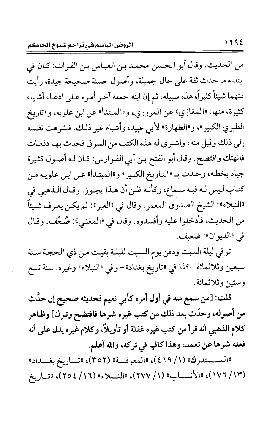 قلت: [من سمع منه في أول أمره كأبي نعيم فحديثه صحيح إن حدَّث من أصوله، وحدّث بعد ذلك من كتب غيره شرها فافتضح وترك] وظاهر كلام الذهبي أنه قرأ من كتب غيره كفلة أو تأويلًا، وكلام غيره يدل على أنه فعله شرها عن تعمد، وهذا كافٍ في تركه، والله أعلم.
