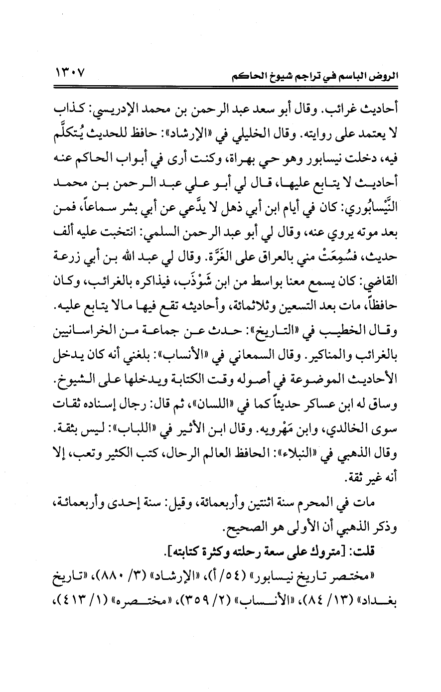 "مختصر تاريخ نيسابور" (54/ أ)، "الإرشاد" (3/ 880)، "تاريخ بغداد" (13/ 84)، "الأنساب" (2/ 359)، "مختصره" (1/ 413)،