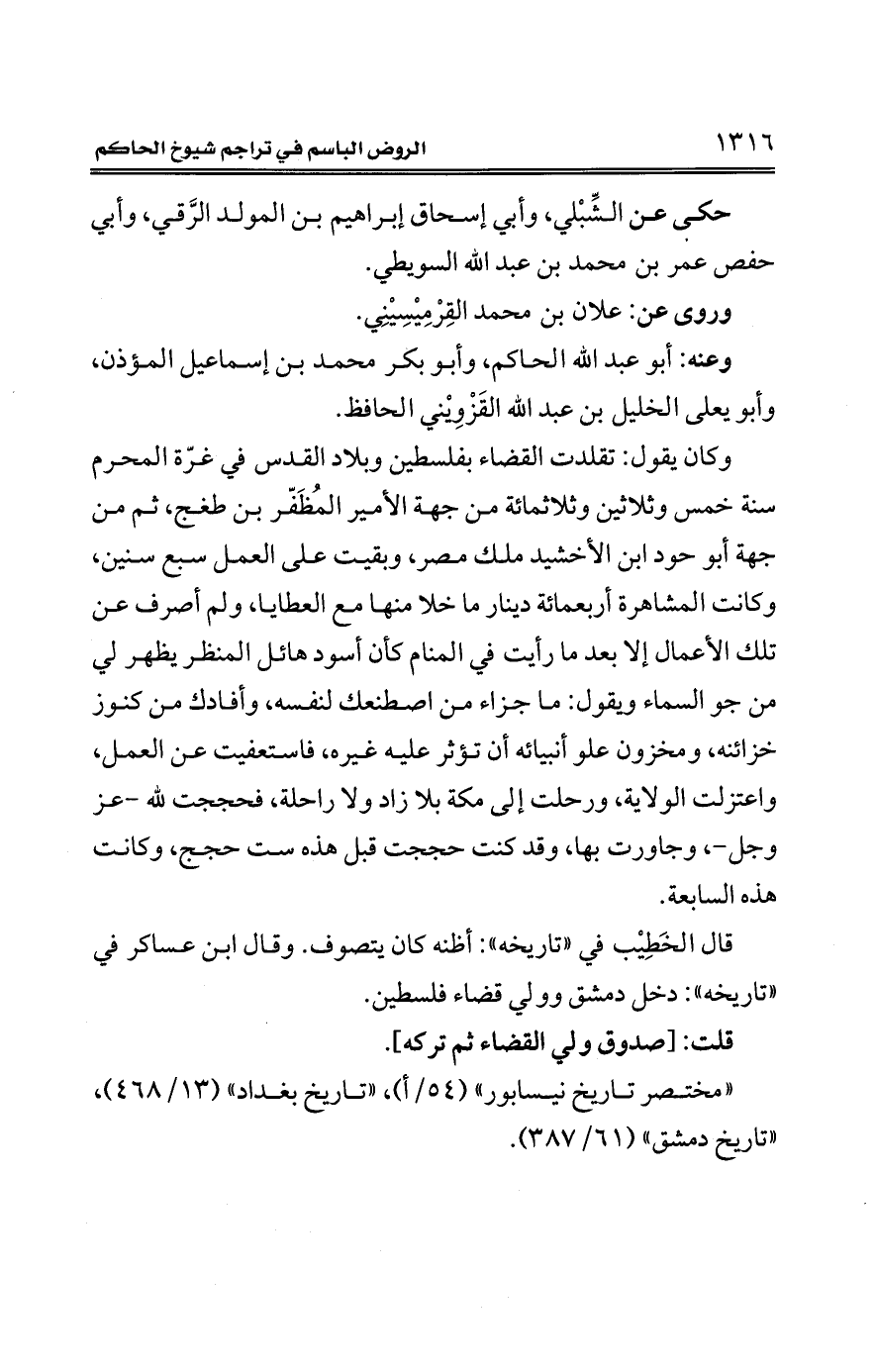 "مختصر تاريخ نيسابور" (54/ أ)، "تاريخ بغداد" (13/ 468)، "تاريخ دمشق" (61/ 387)