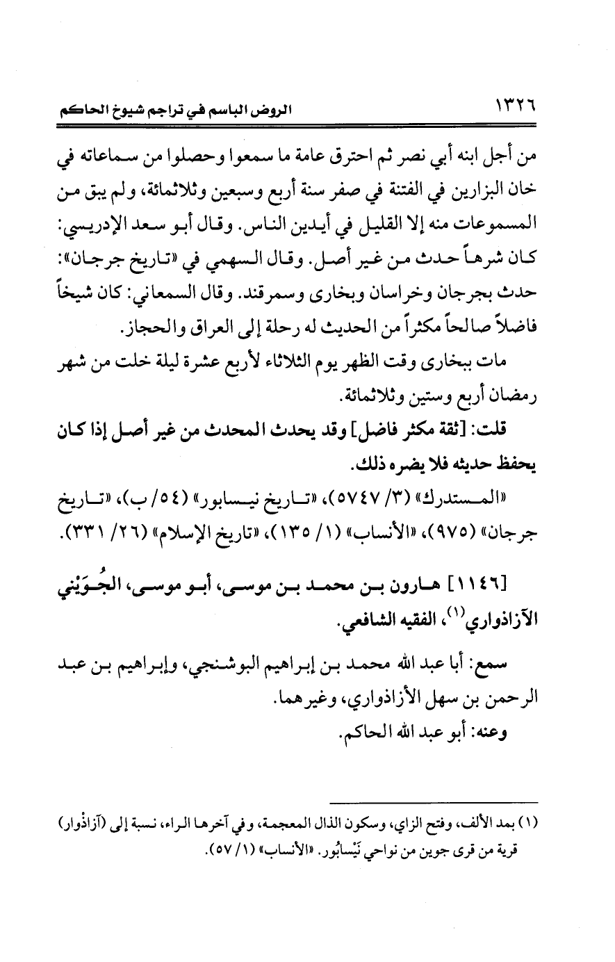 [1146] هارون بن محمد بن موسى، أبو موسى، الجُوَيْني الآزاذواري (¬1)، الفقيه الشافعي.