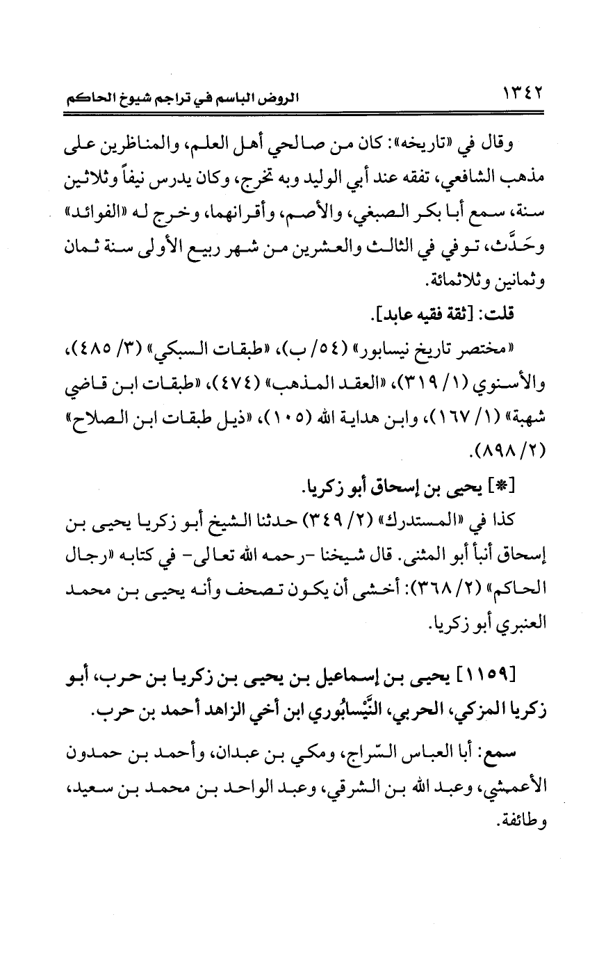 [1159] يحيى بن إسماعيل بن يحيى بن زكريا بن حرب، أبو زكريا المزكي، الحربي، النيْسابُوري ابن أخي الزاهد أحمد بن حرب.