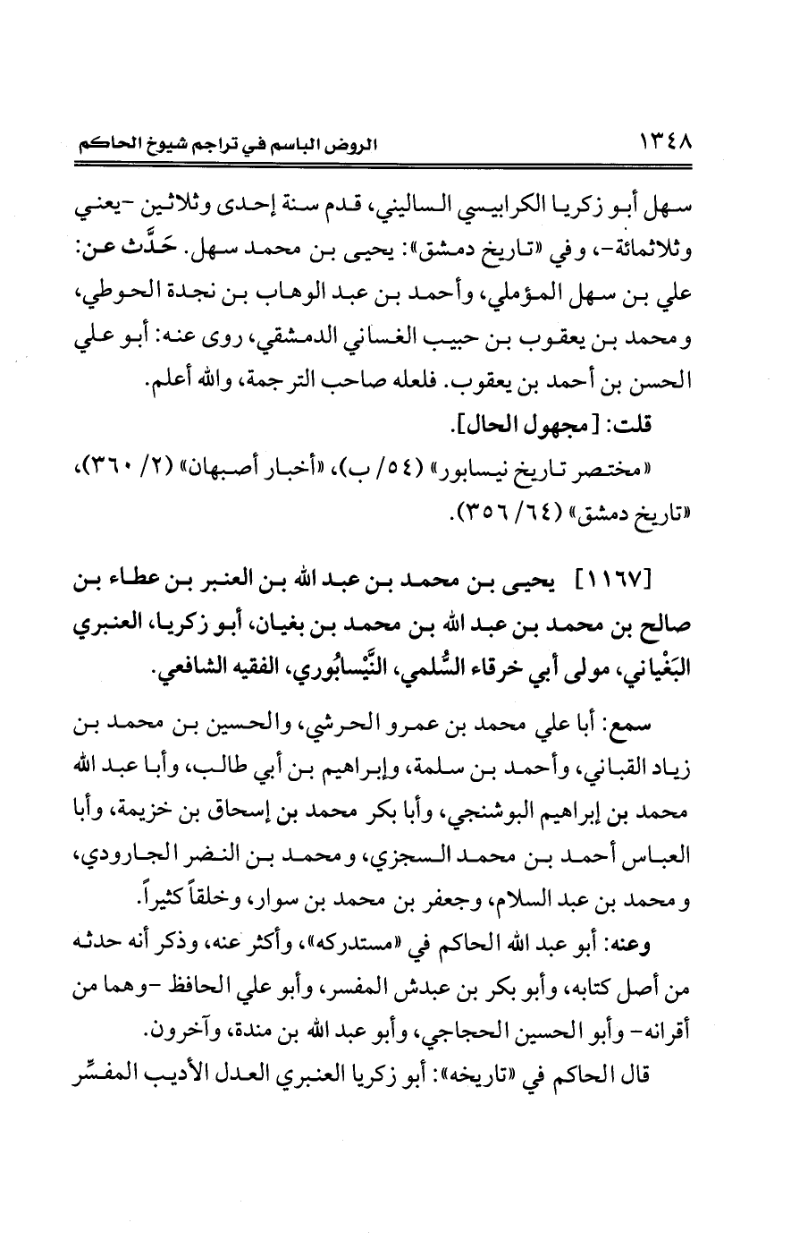 [1167] يحيى بن محمد بن عبد الله بن العنبري عطاء بن صالح بن محمد بن عبد الله بن محمد بن بغيان، أبو زكريا، العنبري البَغْياني، مولى أبي خرقاء السُّلمي، النَّيْسابُوري، الفقيه الشافعي.