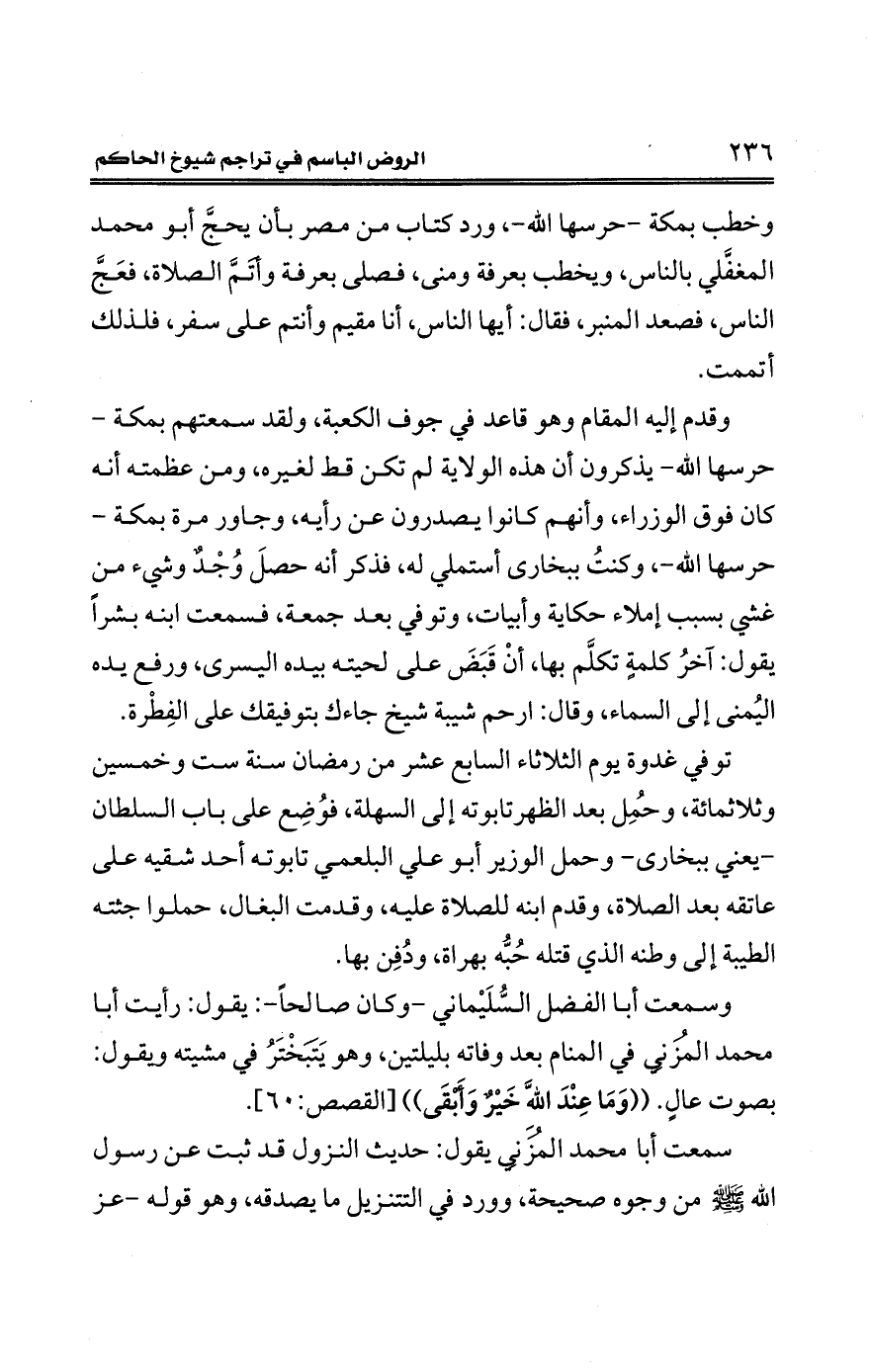 وسمعت أبا الفضل السُّلَيْماني -وكان صالحًا-: يقول: رأيت أبا محمد المُزَنيِ في المنام بعد وفاته بليلتين، وهو يَتَبَخْتَرُ في مشيته ويقول: بصوت عالٍ. {وَمَا عِنْدَ اللَّهِ خَيْرٌ وَأَبْقَى} [القصص: 60].