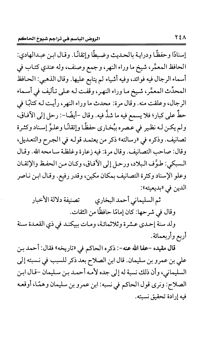 قال مقيده-عفا الله عنه-: ذكره الحاكم في "تاريخه" فقال: أحمد بن علي بن عمرو بن سليمان. قال ابن الصلاح بعد ذكر للسبب في نسبته إلى السليماني، وأن ذلك نسبة له إلى جده لأمه أحمد بن سليمان - قال ابن الصلاح: ونرى قول الحاكم في نسبه: ابن عمرو بن سليمان وهمًا، أوقعه فيه إرادة تحقيق نسبته.