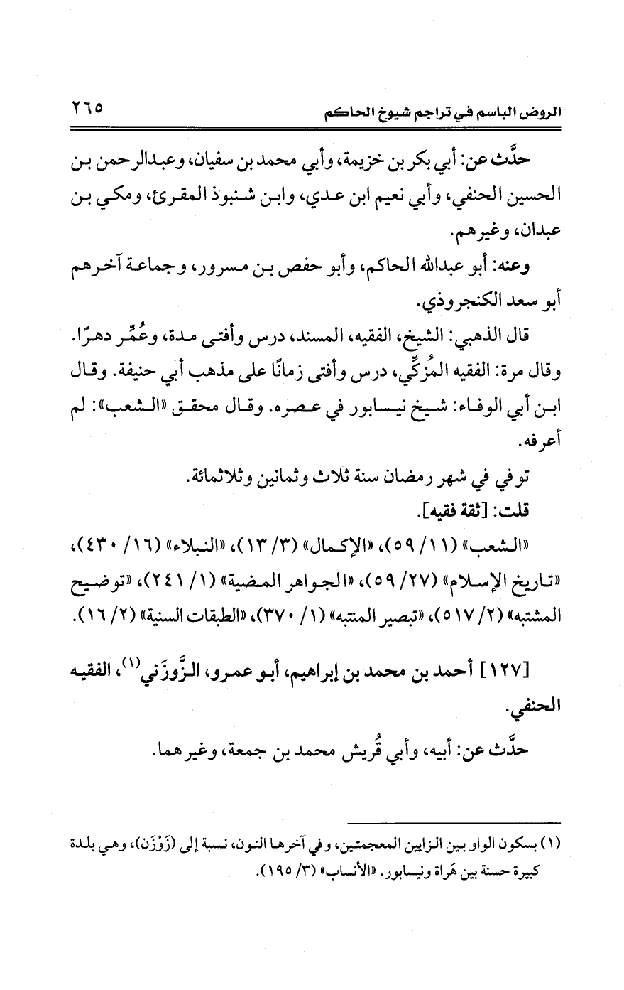 (¬1) بسكون الواو بين الزايين المعجمتين، وفي آخرها النون، نسبة إلى (زَوْزَن)، وهي بلدة كبيرة حسنة بين هَراة ونيسابور. "الإنساب" (3/ 195).