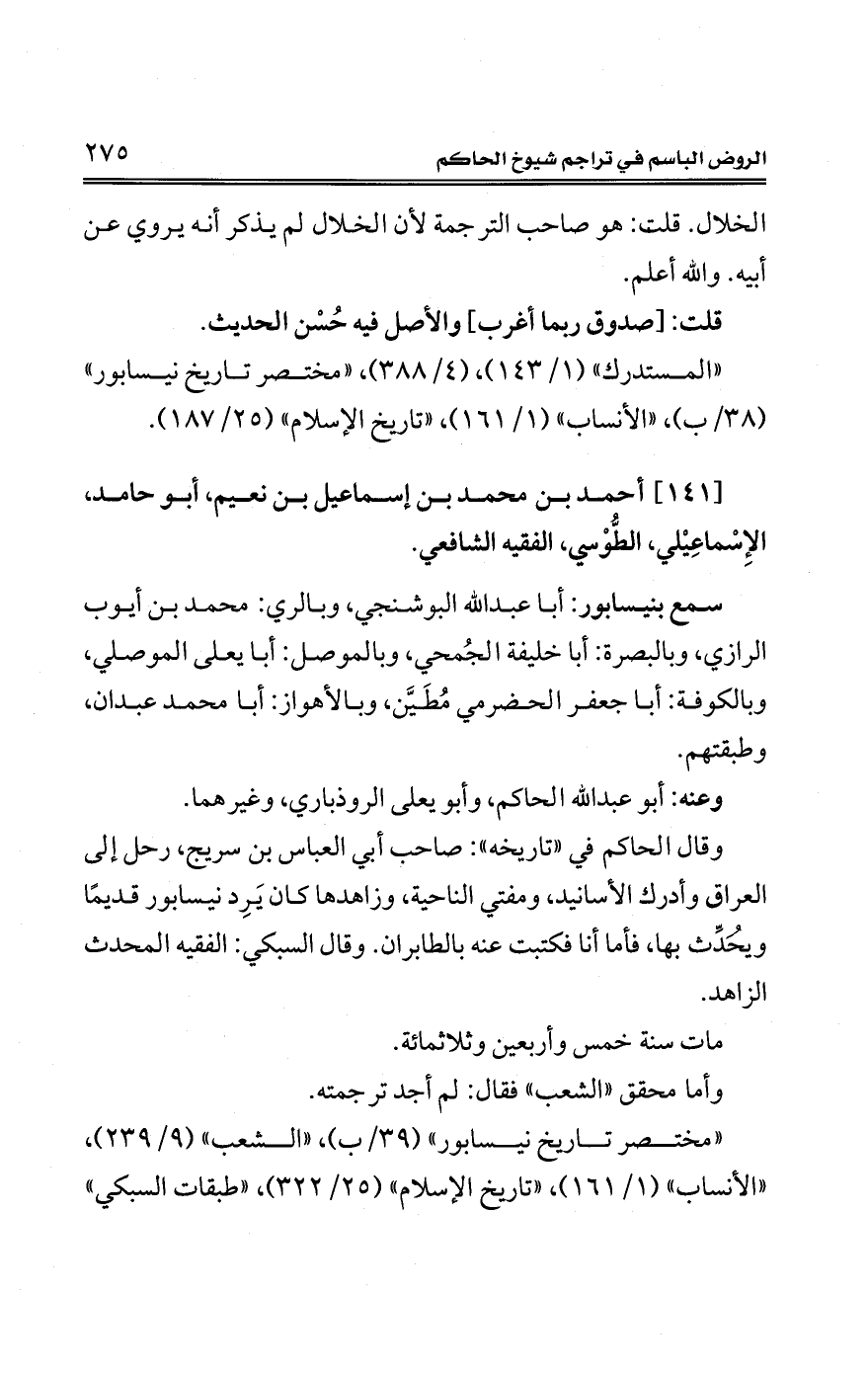 "مختصر تاريخ نيسابور" (39/ ب)، "الشعب" (9/ 239)، "الإنساب" (1/ 161)، "تاريخ الإِسلام" (25/ 322)، "طبقات السبكي"