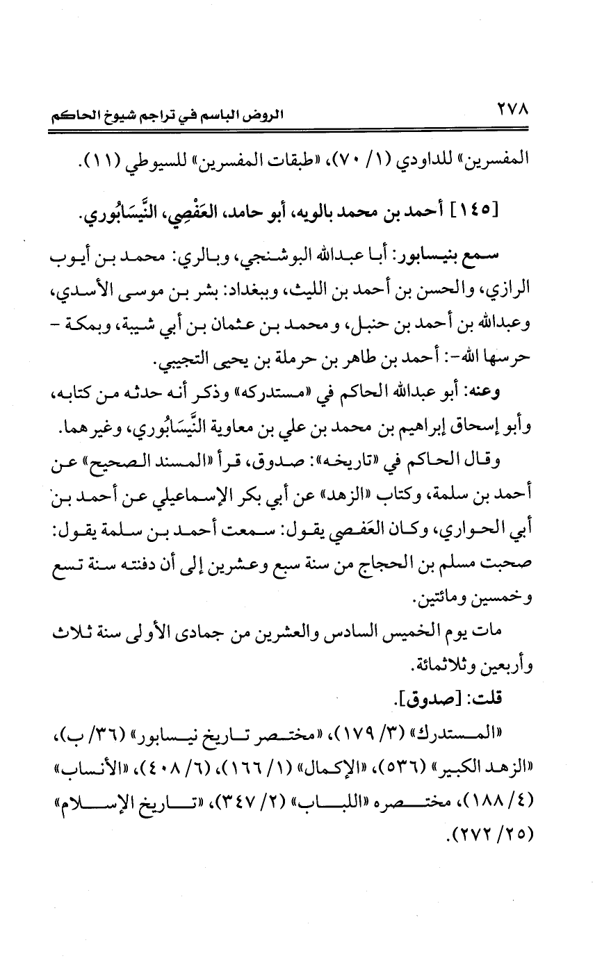 وقال الحاكم في "تاريخه": صدوق، قرأ "المسند الصحيح" عن أحمد بن سلمة، وكتاب "الزهد" عن أبي بكر الإسماعيلي عن أحمد بن أبي الحواري، وكان العَفصي يقول: سمعت أحمد بن سلمة يقول: صحبت مسلم بن الحجاج من سنة سبع وعشرين إلى أن دفنته سنة تسع وخمسين ومائتين.