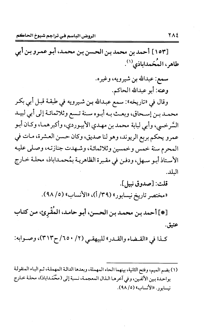 (¬1) بضم الميم، وفتح الثانية، بينهما الحاء المهملة، وبعدها الدالة المهملة، ثم الباء المنقولة بواحدة بين الألفين، وفي آخرها الذال المعجمة، نسبة إلى (مُحْمَداباذ)، محلة خارج نيسابور. "الأنساب" (5/ 98).