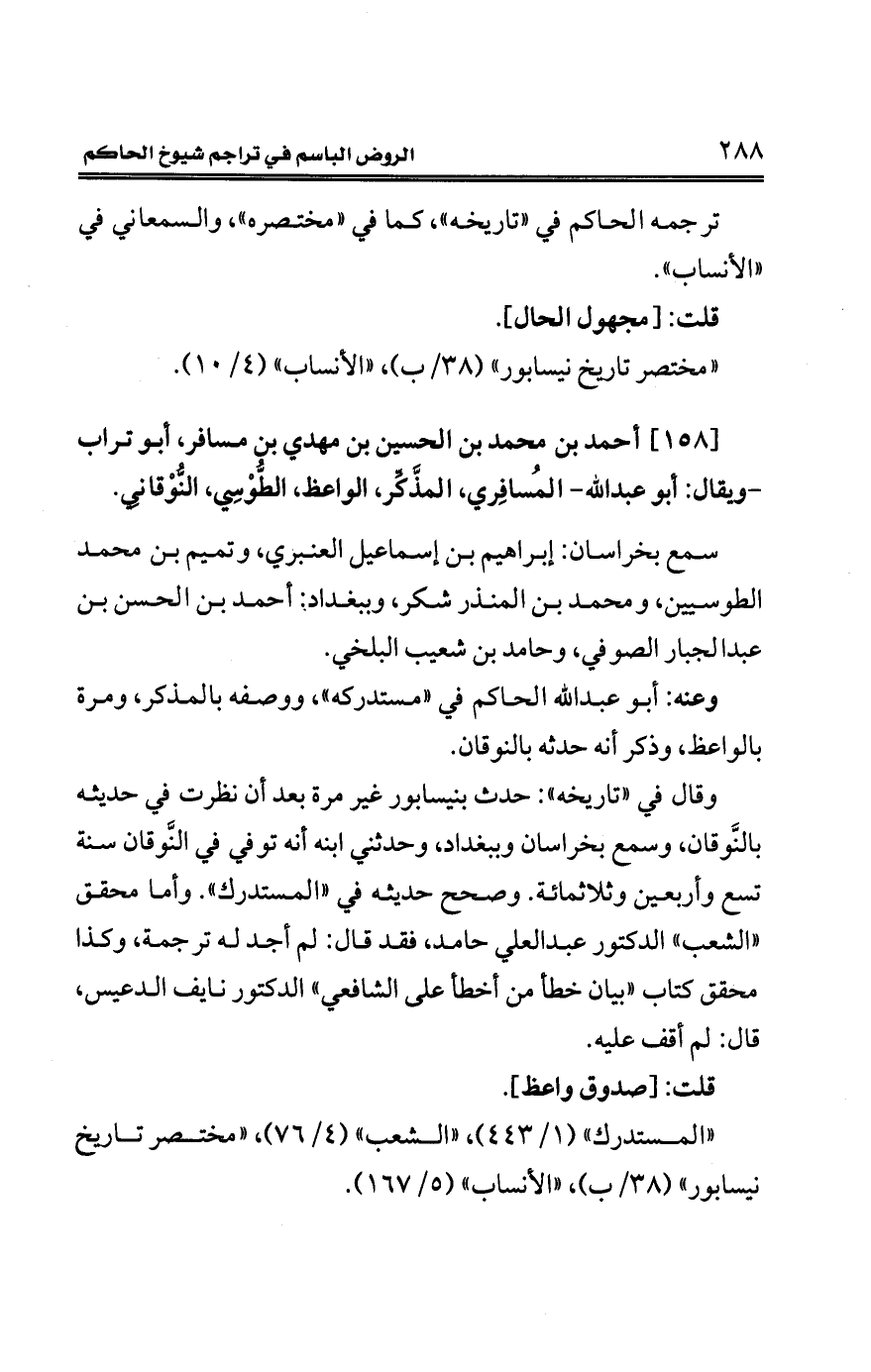 "المستدرك" (1/ 443)، "الشعب" (4/ 76)، "مختصر تاريخ نيسابور" (38/ ب)، "الأنساب" (5/ 167).