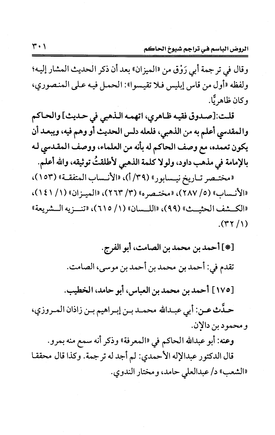 قلت: [صدوق فقيه ظاهري، اتهمه الذهبي في حديث] والحاكم والمقدسي أعلم به من الذهبي، فلعله دلس الحديث أو وهم فيه، ويبعد أن يكون تعمده، مع وصف الحاكم له بأنه من العلماء، ووصف المقدسي له بالإمامة في مذهب داود، ولولا كلمة الذهبي لأطلقتُ توثيقه، والله أعلم.
