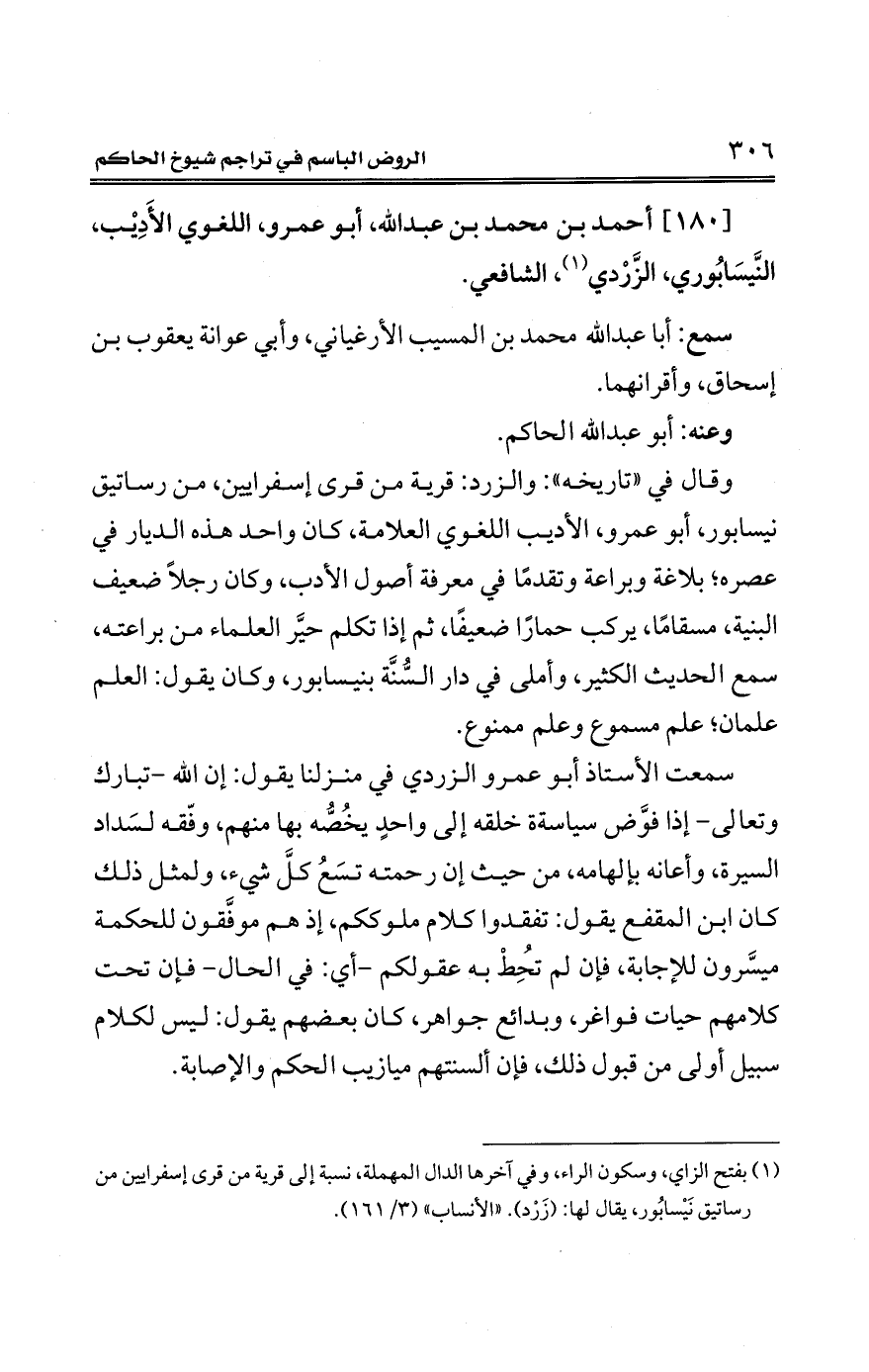 وقال في "تاريخه": والزرد: قرية من قرى إسفرايين، من رساتيق نيسابور، أبو عمرو، الأديب اللغوي العلامة، كان واحد هذه الديار في عصره؛ بلاغة وبراعة وتقدمًا في معرفة أصول الأدب، وكان رجلًا ضعيف البنية، مسقامًا، يركب حمارًا ضعيفًا، ثم إذا تكلم حيَّر العلماء من براعته، سمع الحديث الكثير، وأملى في دار السُّنَّة بنيسابور، وكان يقول: العلم علمان؛ علم مسموع وعلم ممنوع.