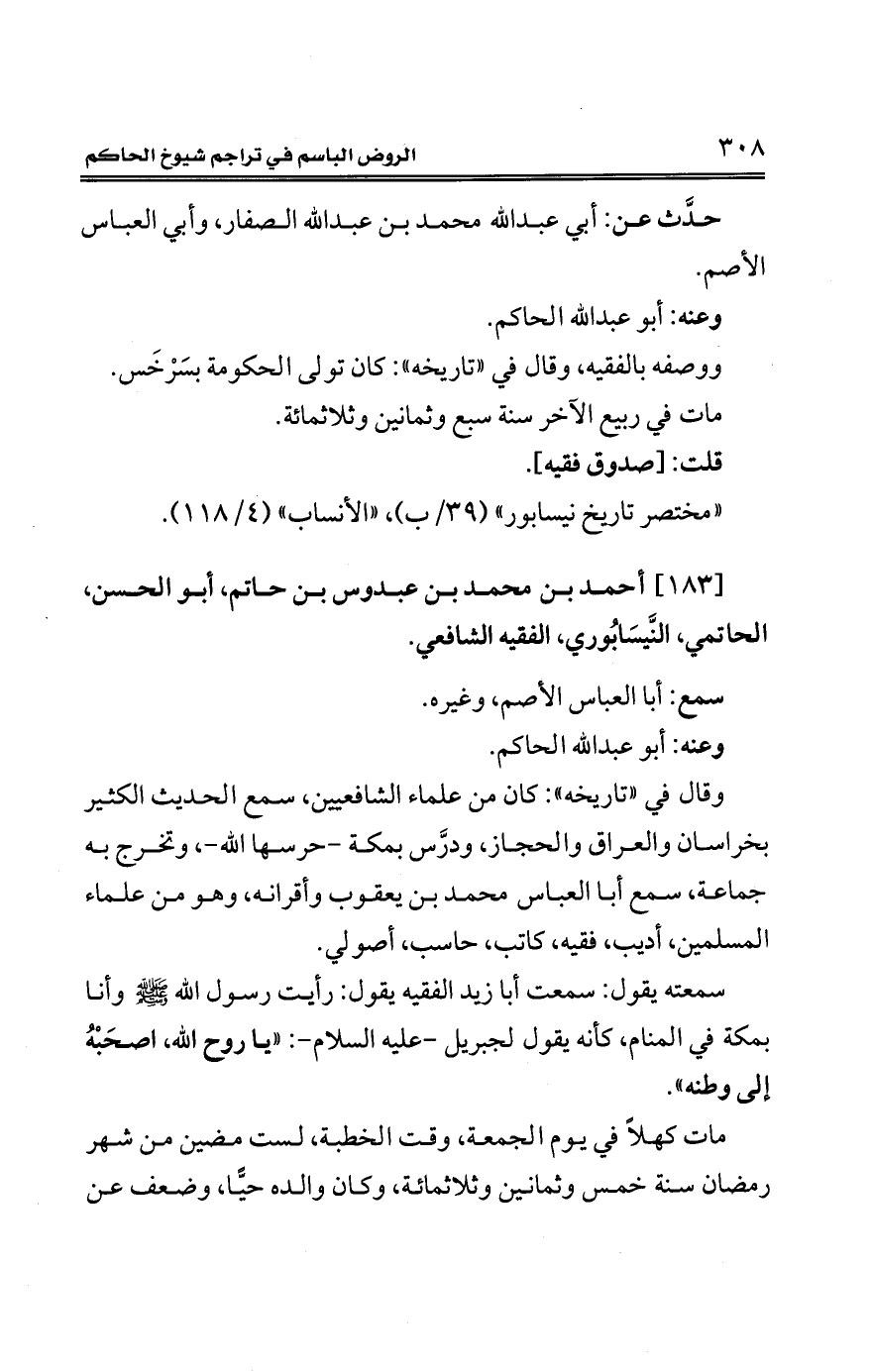 [183] أحمد بن محمَّد بن عبدوس بن حاتم، أبو الحسن، الحاتمي، النَّيسَابُوري، الفقيه الشافعي.
