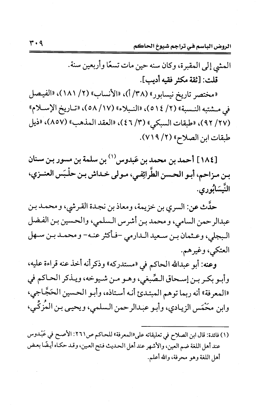 (¬1) فائدة: قال ابن الصلاح في تعليقاته على "المعرفة" للحاكم ص 261: الأصح في عَبْدوس عند أهل اللغة ضم العين، والأشهر عند أهل الحديث فتح العين، وقد حكاه أيضًا بعض أهل اللغة وهو محرفة، والله أعلم.