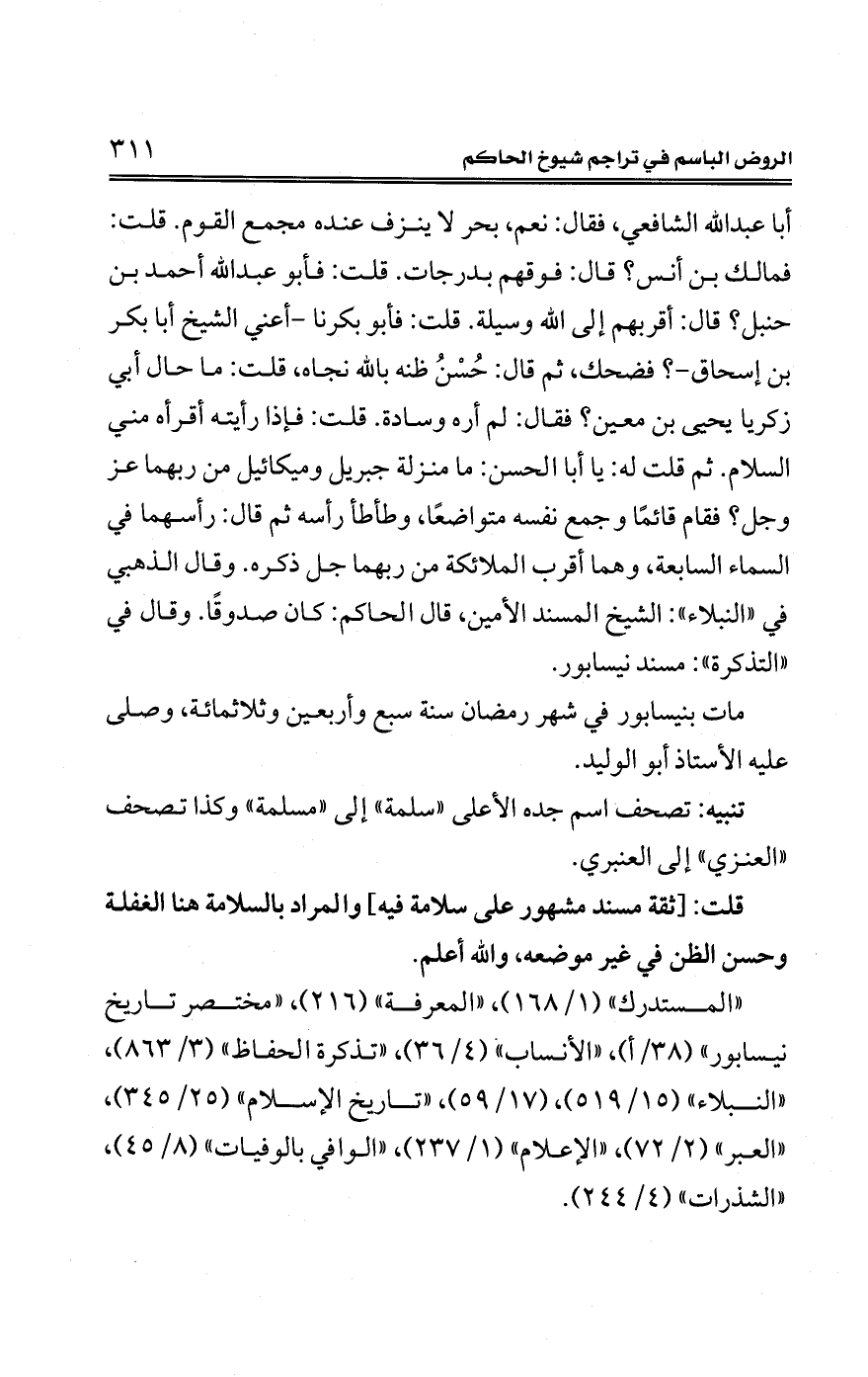أبا عبد الله الشافعي، فقال: نعم، بحر لا ينزف عنده مجمع القوم. قلت: فمالك بن أنس؟ قال: فوقهم بدرجات. قلت: فأبو عبد الله أحمد بن حنبل؟ قال: أقربهم إلى الله وسيلة. قلت: فأبو بكرنا -أعني الشيخ أبا بكر بن إسحاق-؟ فضحك، ثم قال: حُسْنُ ظنه بالله نجاه، قلت: ما حال أبي زكريا يحيى بن معين؟ فقال: لم أره وسادة. قلت: فإذا رأيته أقرأه مني السلام. ثم قلت له: يا أبا الحسن: ما منزلة جبريل وميكائيل من ربهما عز وجل؟ فقام قائمًا وجمع نفسه متواضعًا، وطأطأ رأسه ثم قال: رأسهما في السماء السابعة، وهما أقرب الملائكة من ربهما جل ذكره. وقال الذهبي في "النبلاء": الشيخ المسند الأمين، قال الحاكم: كان صدوقًا. وقال في "التذكرة": مسند نيسابور.