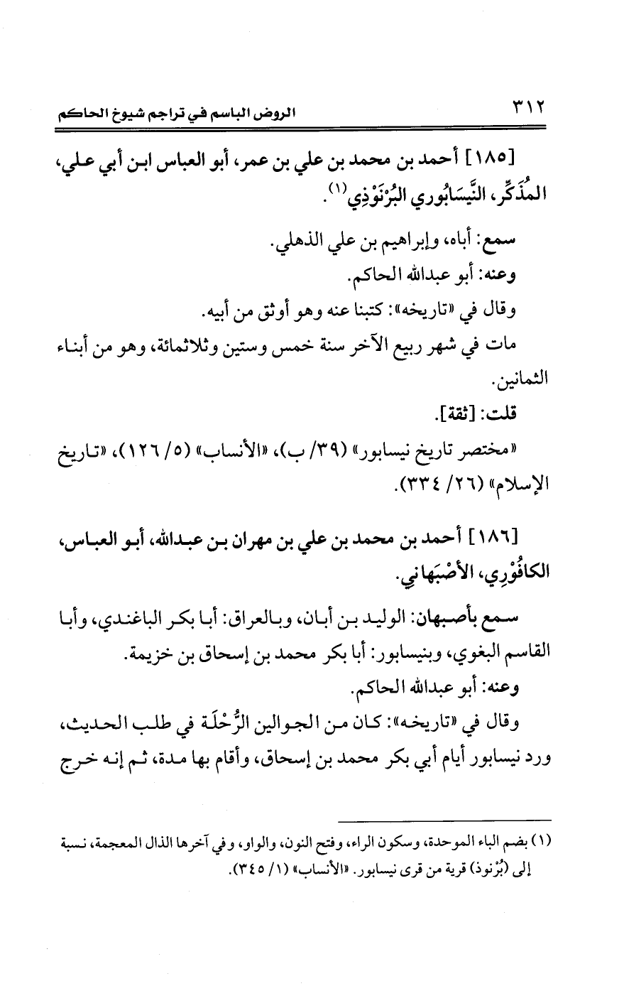 (¬1) بضم الباء الموحدة، وسكون الراء، وفتح النون، والواو، وفي آخرها الذال المعجمة، نسبة إلي (بُرْنوذ) قرية من قرى نيسابور. "الأنساب" (1/ 345).