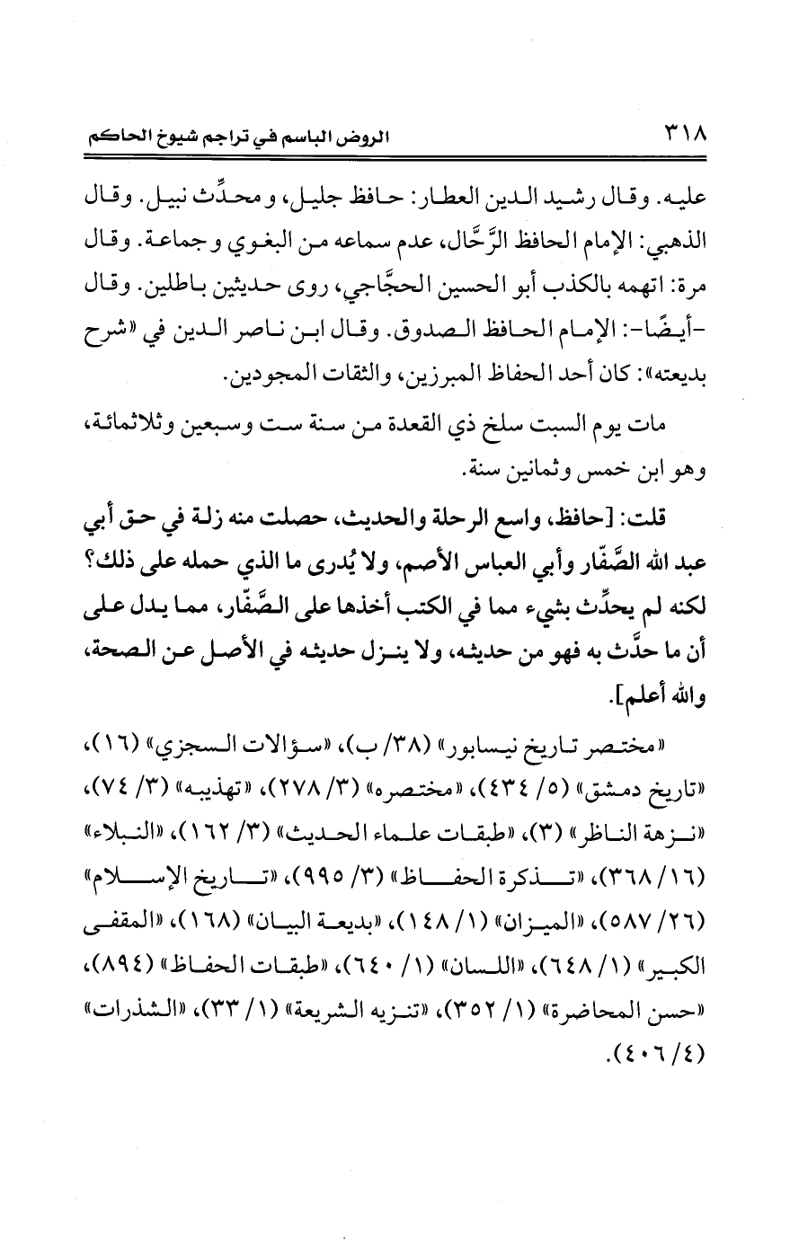 "مختصر تاريخ نيسابور" (38/ ب)، "سؤالات السجزي" (16)، "تاريخ دمشق" (5/ 434)، "مختصره" (3/ 278)، "تهذيبه" (3/ 74)، "نزهة الناظر" (3)، "طبقات علماء الحديث" (3/ 162)، "النبلاء" (16/ 368)، "تذكرة الحفاظ" (3/ 995)، "تاريخ الإِسلام" (26/ 587)، "الميزان" (1/ 148)، "بديعة البيان" (168)، "المقفى الكبير" (1/ 648)، "اللسان" (1/ 640)، "طبقات الحفاظ" (894)، "حسن المحا ضرة" (1/ 352)، "تنزيه الشريعة" (1/ 33)، "الشذرات" (4/ 406)