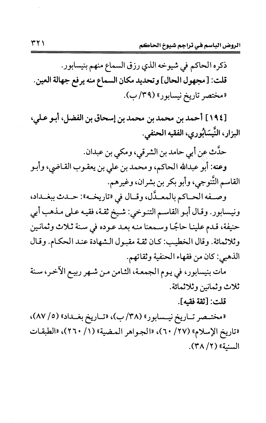 "مختصر تاريخ نيسابور" (38/ ب)، "تاريخ بغداد" (5/ 87)، "تاريخ الإِسلام" (27/ 60)، "الجواهر المضية" (1/ 260)، "الطبقات السنية" (2/ 38).
