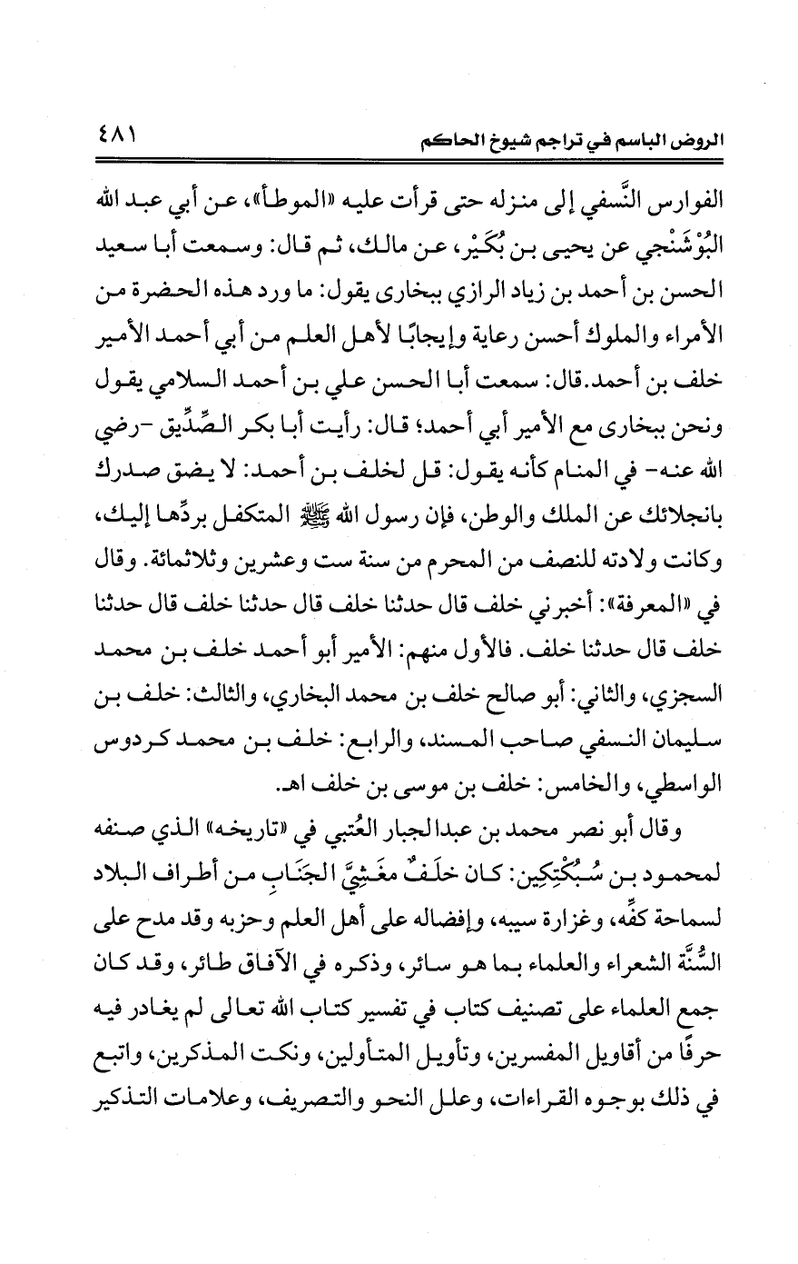 الفوارس النَّسفي إلى منزله حتى قرأت عليه "الموطأ"، عن أبي عبد الله البُوْشَنْجي عن يحيى بن بُكَيْر، عن مالك، ثم قال: وسمعت أبا سعيد الحسن بن أحمد بن زياد الرازي ببخارى يقول: ما ورد هذه الحضرة من الأمراء والملوك أحسن رعاية وإيجابًا لأهل العلم من أبي أحمد الأمير خلف بن أحمد. قال: سمعت أبا الحسن علي بن أحمد السلامي يقول ونحن ببخارى مع الأمير أبي أحمد؛ قال: رأيت أبا بكر الصِّدِّيق - رضي الله عنه- في المنام كأنه يقول: قل لخلف بن أحمد: لا يضق صدرك بانجلائك عن الملك والوطن، فإن رسول الله -صلى الله عليه وسلم- المتكفل بردِّها إليك، وكانت ولادته للنصف من المحرم من سنة ست وعشرين وثلاثمائة. وقال في "المعرفة": أخبرني خلف قال حدثنا خلف قال حدثنا خلف قال حدثنا خلف قال حدثنا خلف. فالأول منهم: الأمير أبو أحمد خلف بن محمد السجزي، والثاني: أبو صالح خلف بن محمد البخاري، والثالث: خلف بن سليمان النسفي صاحب المسند، والرابع: خلف بن محمد كردوس الواسطي، والخامس: خلف بن موسى بن خلف اهـ.
