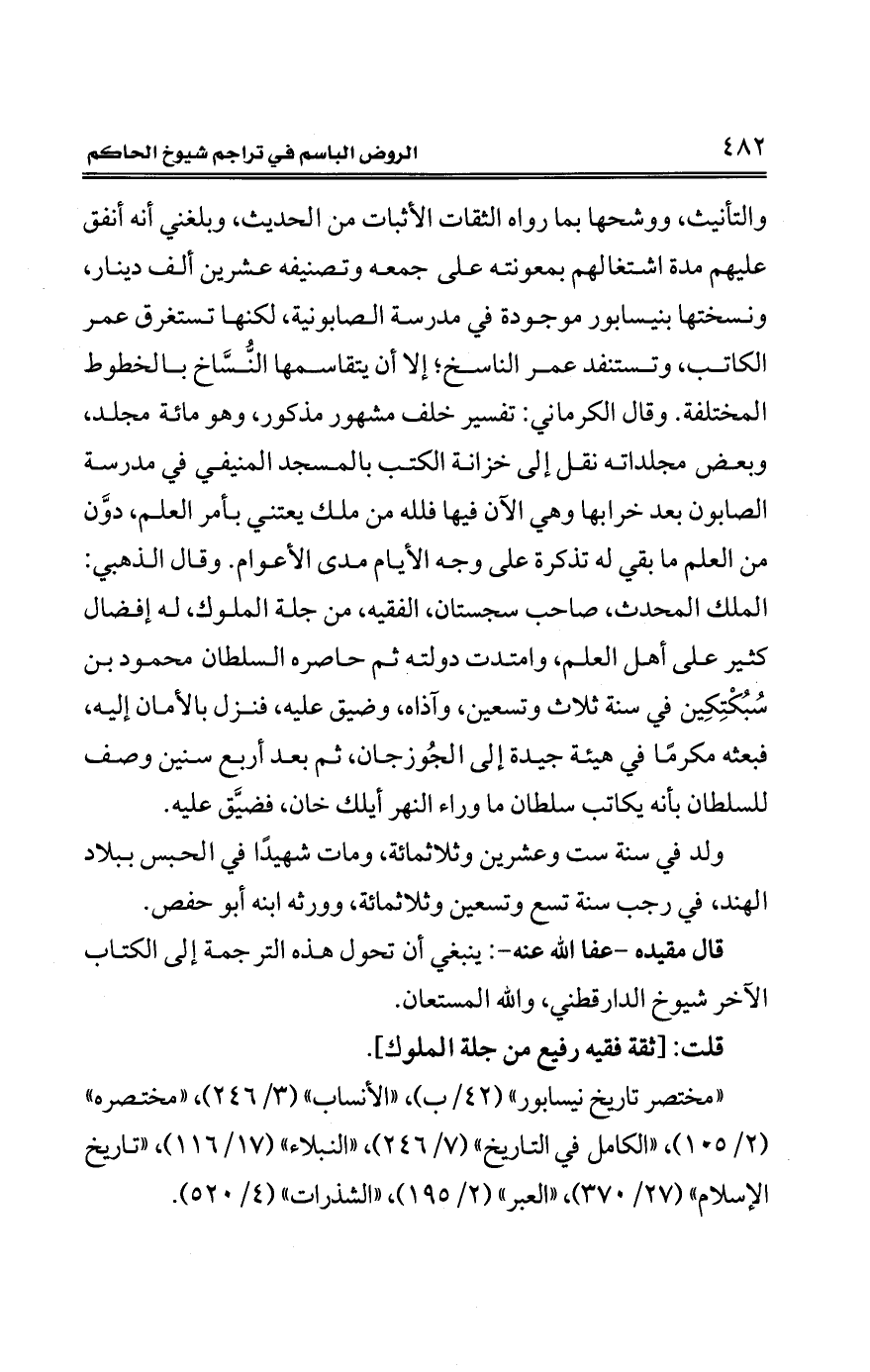 "مختصر تاريخ نيسابور" (42/ب)، "الأنساب" (3/ 246)، "مختصره" (2/ 105)، "الكامل في التاريخ" (7/ 246)، "النبلاء" (17/ 116)، "تاريخ الإسلام" (27/ 370)، "العبر" (2/ 195)، "الشذرات" (4/ 520).