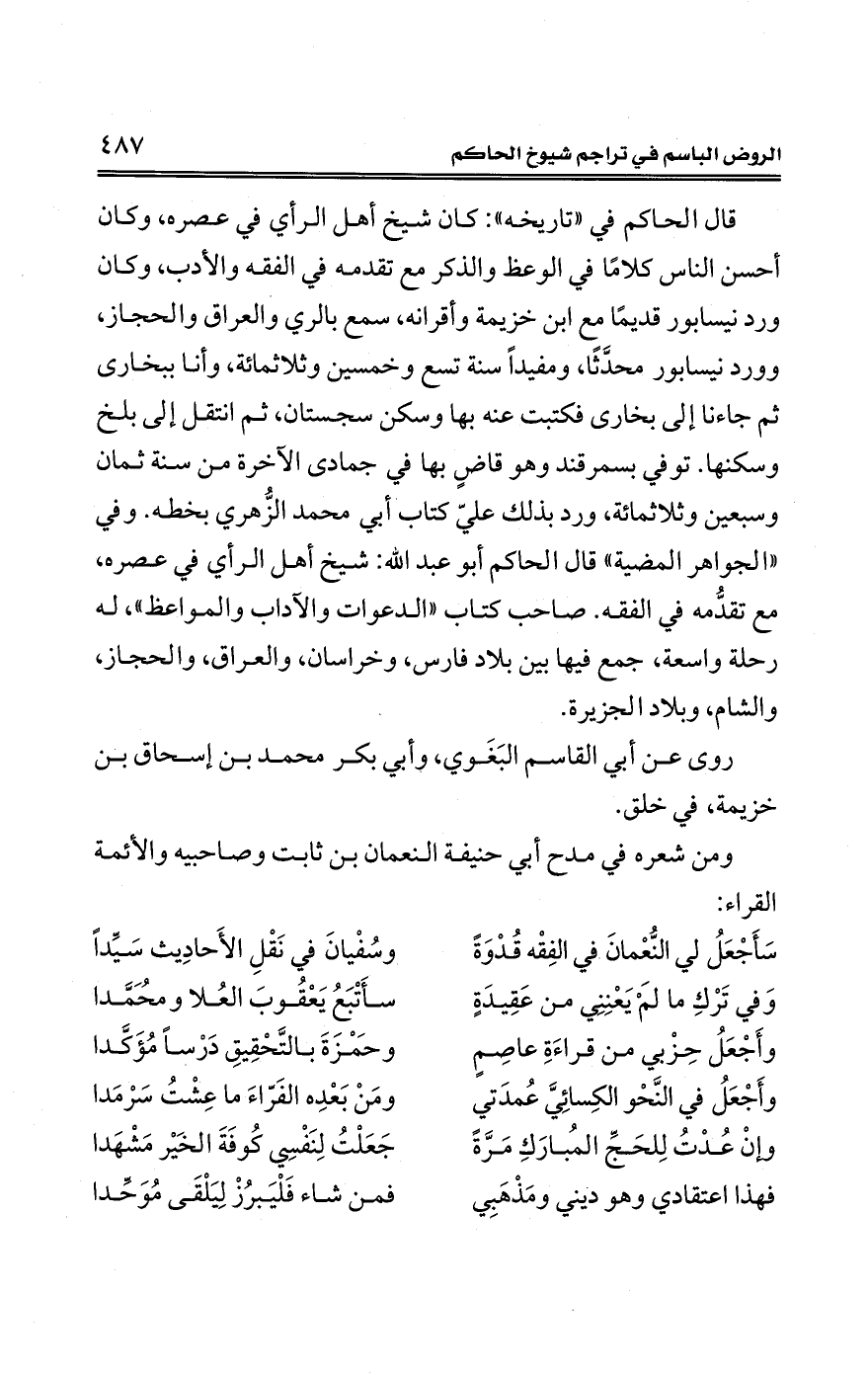 سَأَجْعَلُ لي النُّعْمانَ في الفِقْه قُدوَةً ... وسُفْيانَ في نَقْلِ الأَحادِيث سَيِّدًا