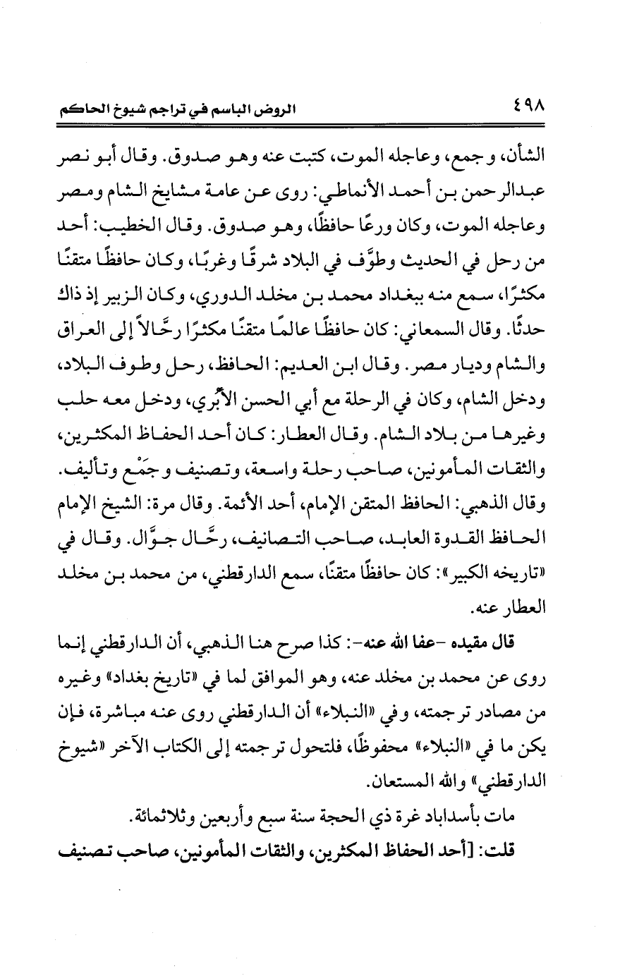 قال مقيده -عفا الله عنه-: كذا صرح هنا الذهبي، أن الدارقطني إنما روى عن محمد بن مخلد عنه، وهو الموافق لما في "تاريخ بغداد" وغيره من مصادر ترجمته، وفي "النبلاء" أن الدارقطني روى عنه مباشرة، فإن يكن ما في "النبلاء" محفوظًا، فلتحول ترجمته إلى الكتاب الآخر "شيوخ الدارقطني" والله المستعان.